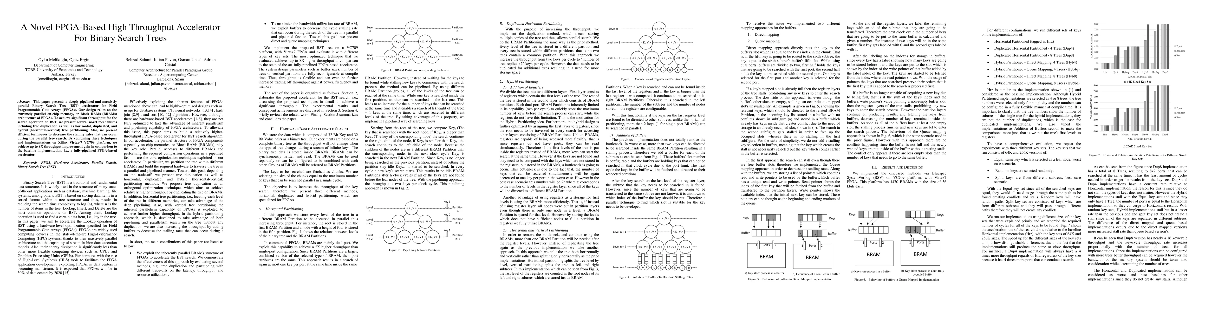 This paper introduces a high-throughput FPGA-based accelerator for Binary Search Trees using parallel processing and tree partitioning techniques, achieving up to 8X improvement in search operation throughput compared to baseline implementations.