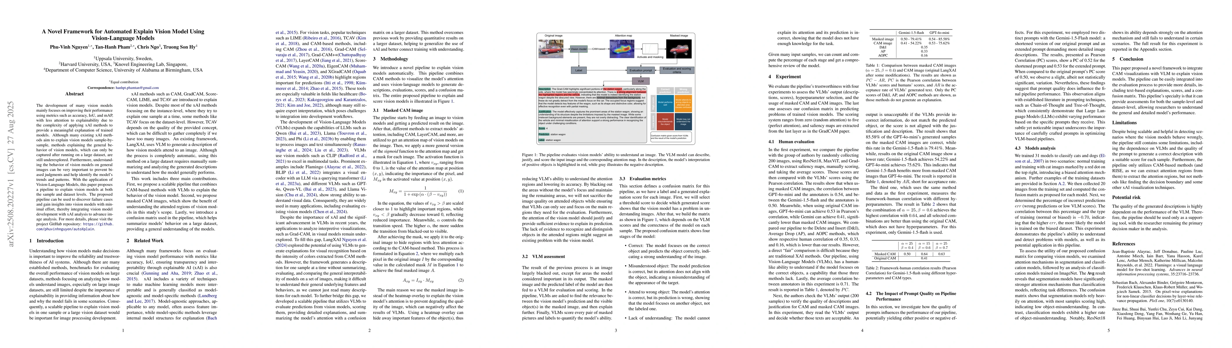 The development of many vision models mainly focuses on improving their performance using metrics such as accuracy, IoU, and mAP, with less attention to explainability due to the complexity of applying xAI methods to provide a meaningful explanation of trained models. Although many existing xAI methods aim to explain vision models sample-by-sample, methods explaining the general behavior of vision models, which can only be captured after running on a large dataset, are still underexplored. Furthermore, understanding the behavior of vision models on general images can be very important to prevent biased judgments and help identify the model's trends and patterns. With the application of Vision-Language Models, this paper proposes a pipeline to explain vision models at both the sample and dataset levels. The proposed pipeline can be used to discover failure cases and gain insights into vision models with minimal effort, thereby integrating vision model development with xAI analysis to advance image analysis.