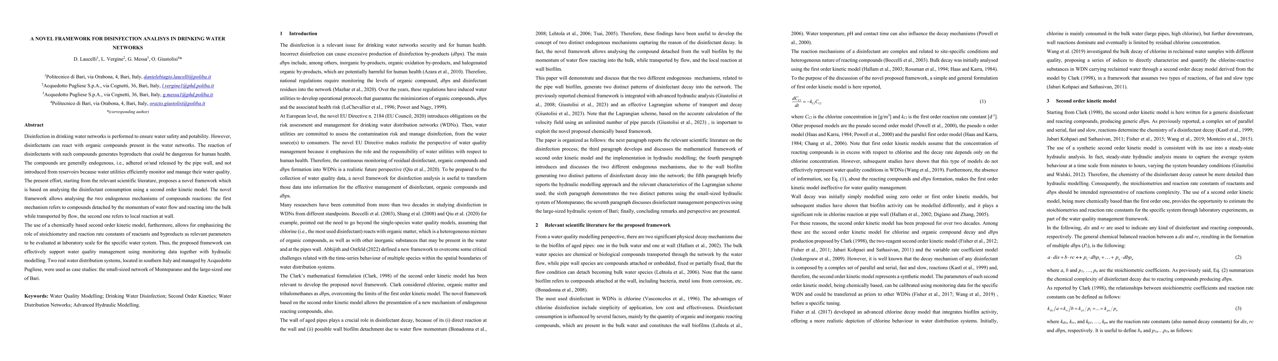 Disinfection in drinking water networks is performed to ensure water safety and potability. However, disinfectants can react with organic compounds present in the water networks. The reaction of disinfectants with such compounds generates byproducts that could be dangerous for human health. The compounds are generally endogenous, i.e., adhered or/and released by the pipe wall, and not introduced from reservoirs because water utilities efficiently monitor and manage their water quality. The present effort, starting from the relevant scientific literature, proposes a novel framework which is based on analysing the disinfectant consumption using a second order kinetic model. The novel framework allows analysing the two endogenous mechanisms of compounds reactions: the first mechanism refers to compounds detached by the momentum of water flow and reacting into the bulk while transported by flow, the second one refers to local reaction at wall. The use of a chemically based second order kinetic model, furthermore, allows for emphasizing the role of stoichiometry and reaction rate constants of reactants and byproducts as relevant parameters to be evaluated at laboratory scale for the specific water system. Thus, the proposed framework can effectively support water quality management using monitoring data together with hydraulic modelling. Two real water distribution systems, located in southern Italy and managed by Acquedotto Pugliese, were used as case studies: the small-sized network of Monteparano and the large-sized one of Bari.