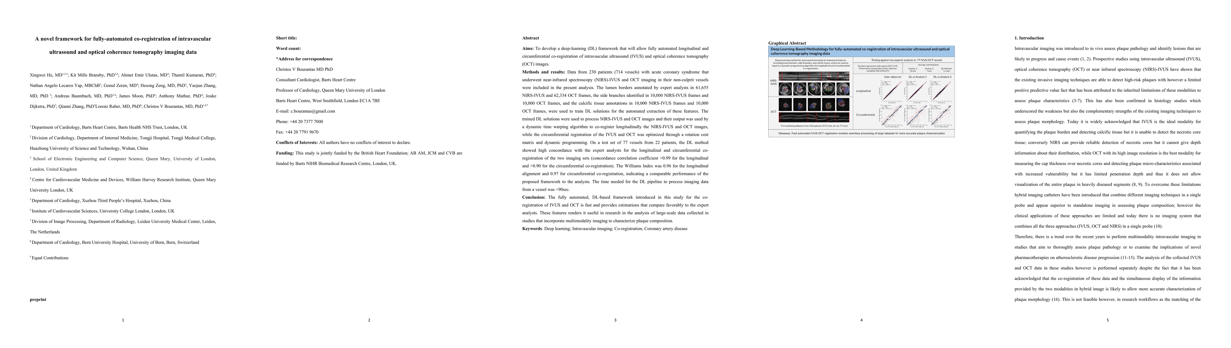 Aims: To develop a deep-learning (DL) framework that will allow fully automated longitudinal and circumferential co-registration of intravascular ultrasound (IVUS) and optical coherence tomography (OCT) images. Methods and results: Data from 230 patients (714 vessels) with acute coronary syndrome that underwent near-infrared spectroscopy (NIRS)-IVUS and OCT imaging in their non-culprit vessels were included in the present analysis. The lumen borders annotated by expert analysts in 61,655 NIRS-IVUS and 62,334 OCT frames, and the side branches and calcific tissue identified in 10,000 NIRS-IVUS frames and 10,000 OCT frames, were used to train DL solutions for the automated extraction of these features. The trained DL solutions were used to process NIRS-IVUS and OCT images and their output was used by a dynamic time warping algorithm to co-register longitudinally the NIRS-IVUS and OCT images, while the circumferential registration of the IVUS and OCT was optimized through dynamic programming. On a test set of 77 vessels from 22 patients, the DL method showed high concordance with the expert analysts for the longitudinal and circumferential co-registration of the two imaging sets (concordance correlation coefficient >0.99 for the longitudinal and >0.90 for the circumferential co-registration). The Williams Index was 0.96 for longitudinal and 0.97 for circumferential co-registration, indicating a comparable performance to the analysts. The time needed for the DL pipeline to process imaging data from a vessel was <90s. Conclusion: The fully automated, DL-based framework introduced in this study for the co-registration of IVUS and OCT is fast and provides estimations that compare favorably to the expert analysts. These features renders it useful in research in the analysis of large-scale data collected in studies that incorporate multimodality imaging to characterize plaque composition.