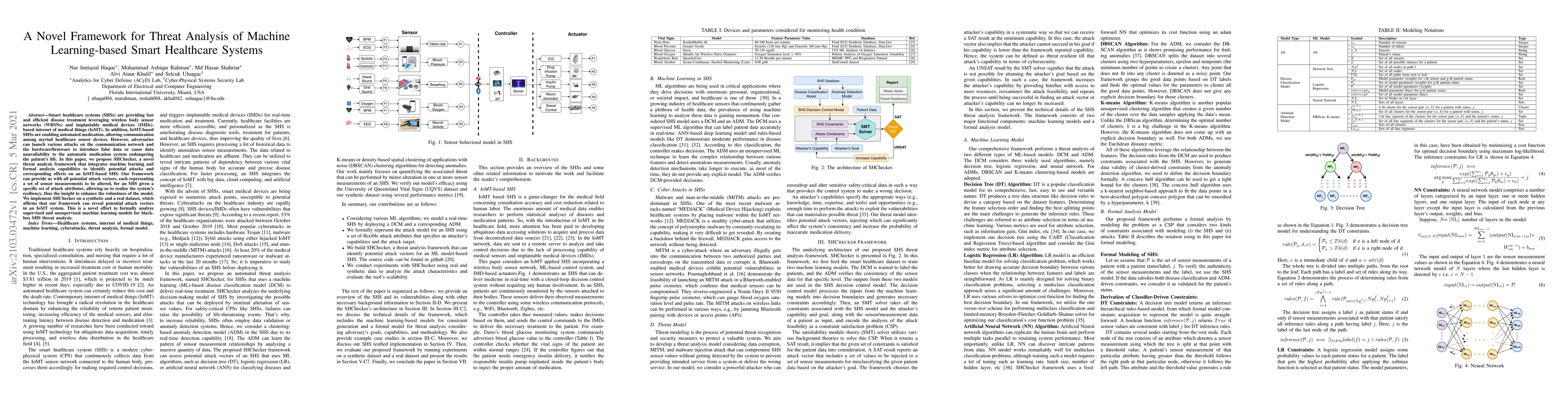 This paper introduces SHChecker, a novel framework for threat analysis in machine learning-based smart healthcare systems, combining machine learning and formal analysis to identify potential attacks and their effects on Internet of Medical Things (IoMT) systems. The framework reveals potential attack vectors, enhancing the system's resiliency and robustness.