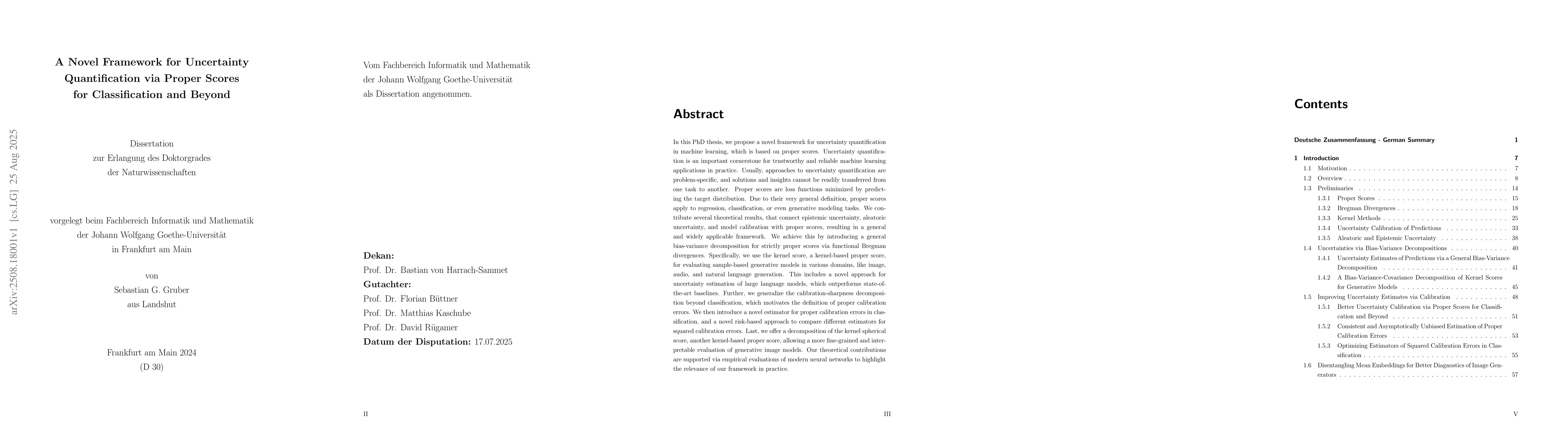 In this PhD thesis, we propose a novel framework for uncertainty quantification in machine learning, which is based on proper scores. Uncertainty quantification is an important cornerstone for trustworthy and reliable machine learning applications in practice. Usually, approaches to uncertainty quantification are problem-specific, and solutions and insights cannot be readily transferred from one task to another. Proper scores are loss functions minimized by predicting the target distribution. Due to their very general definition, proper scores apply to regression, classification, or even generative modeling tasks. We contribute several theoretical results, that connect epistemic uncertainty, aleatoric uncertainty, and model calibration with proper scores, resulting in a general and widely applicable framework. We achieve this by introducing a general bias-variance decomposition for strictly proper scores via functional Bregman divergences. Specifically, we use the kernel score, a kernel-based proper score, for evaluating sample-based generative models in various domains, like image, audio, and natural language generation. This includes a novel approach for uncertainty estimation of large language models, which outperforms state-of-the-art baselines. Further, we generalize the calibration-sharpness decomposition beyond classification, which motivates the definition of proper calibration errors. We then introduce a novel estimator for proper calibration errors in classification, and a novel risk-based approach to compare different estimators for squared calibration errors. Last, we offer a decomposition of the kernel spherical score, another kernel-based proper score, allowing a more fine-grained and interpretable evaluation of generative image models.