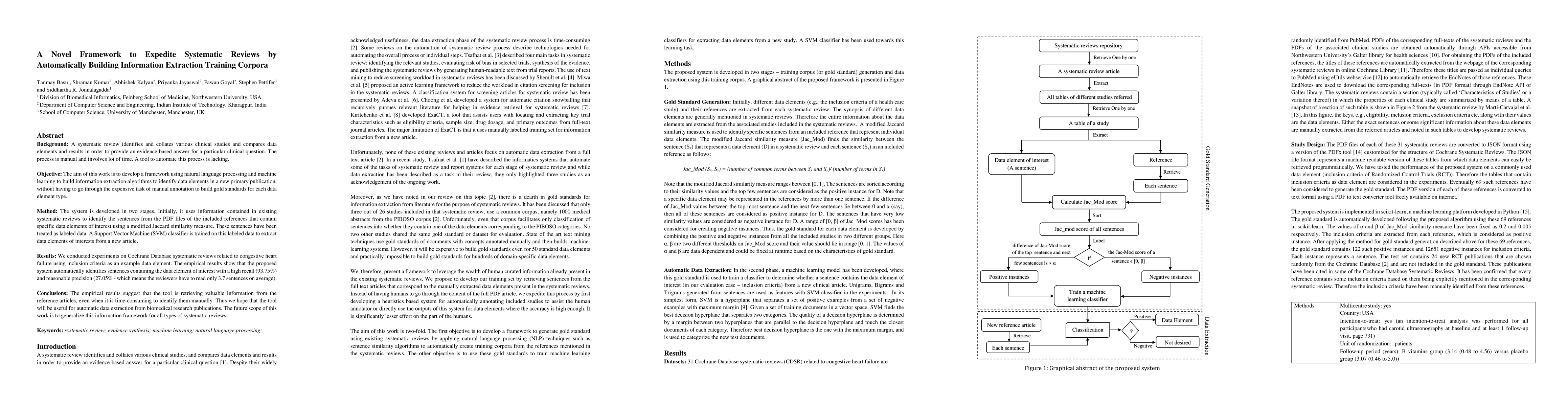 A systematic review identifies and collates various clinical studies and compares data elements and results in order to provide an evidence based answer for a particular clinical question. The process is manual and involves lot of time. A tool to automate this process is lacking. The aim of this work is to develop a framework using natural language processing and machine learning to build information extraction algorithms to identify data elements in a new primary publication, without having to go through the expensive task of manual annotation to build gold standards for each data element type. The system is developed in two stages. Initially, it uses information contained in existing systematic reviews to identify the sentences from the PDF files of the included references that contain specific data elements of interest using a modified Jaccard similarity measure. These sentences have been treated as labeled data.A Support Vector Machine (SVM) classifier is trained on this labeled data to extract data elements of interests from a new article. We conducted experiments on Cochrane Database systematic reviews related to congestive heart failure using inclusion criteria as an example data element. The empirical results show that the proposed system automatically identifies sentences containing the data element of interest with a high recall (93.75%) and reasonable precision (27.05% - which means the reviewers have to read only 3.7 sentences on average). The empirical results suggest that the tool is retrieving valuable information from the reference articles, even when it is time-consuming to identify them manually. Thus we hope that the tool will be useful for automatic data extraction from biomedical research publications. The future scope of this work is to generalize this information framework for all types of systematic reviews.