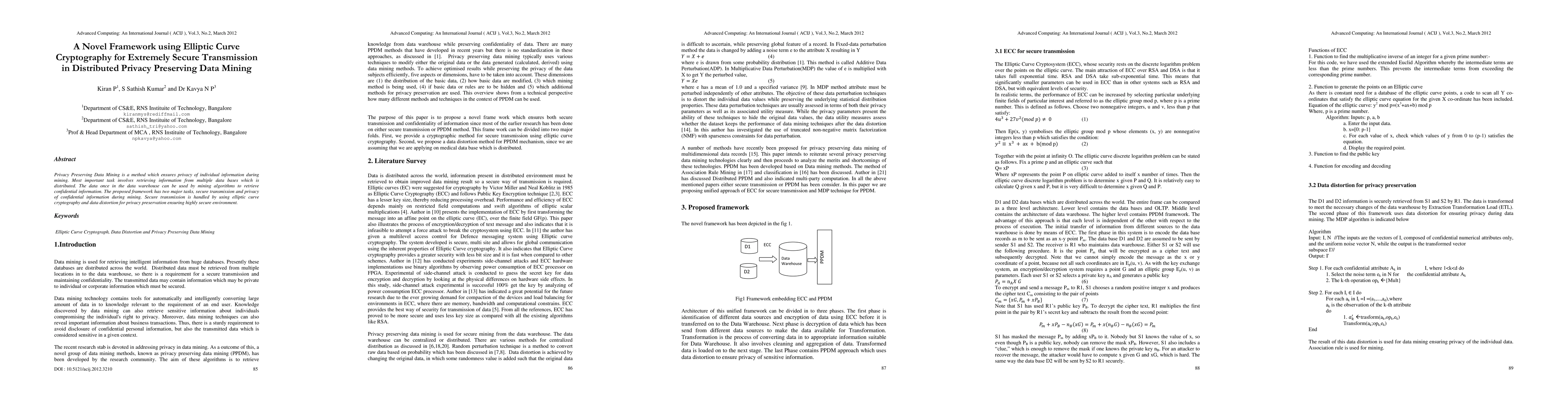 Privacy Preserving Data Mining is a method which ensures privacy of individual information during mining. Most important task involves retrieving information from multiple data bases which is distributed. The data once in the data warehouse can be used by mining algorithms to retrieve confidential information. The proposed framework has two major tasks, secure transmission and privacy of confidential information during mining. Secure transmission is handled by using elliptic curve cryptography and data distortion for privacy preservation ensuring highly secure environment.