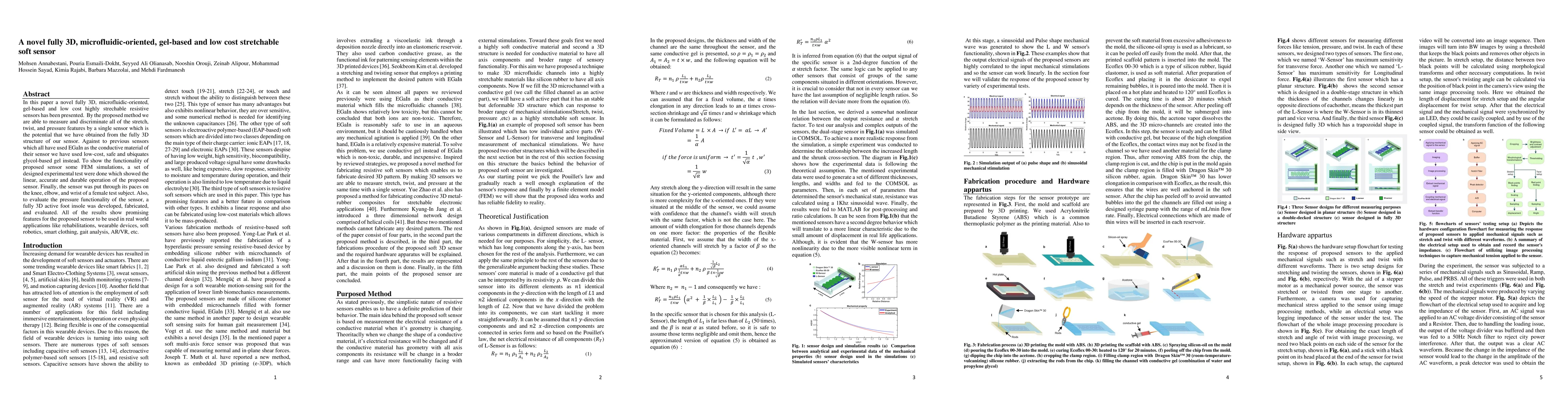 In this paper, a novel fully 3D, microfluidic-oriented, gel-based, and low-cost highly stretchable resistive sensors have been presented. By the proposed method we are able to measure and discriminate all of the stretch, twist, and pressure features by a single sensor which is the potential that we have obtained from the fully 3D structure of our sensor. Against previous sensors which all have used EGaIn as the conductive material of their sensor, we have used low-cost, safe, and ubiquitous glycol-based gel instead. To show the functionality of the proposed sensor some FEM simulations, a set of the designed experimental tests were done which showed the linear, accurate, and durable operation of the proposed sensor. Finally, the sensor was put through its paces on the knee, elbow, and wrist of a female test subject. Also, to evaluate the pressure functionality of the sensor, a fully 3D active foot insole was developed, fabricated, and evaluated. All of the results show promising features for the proposed sensor to be used in real-world applications like rehabilitation, wearable devices, soft robotics, smart clothing, gait analysis, AR/VR, etc.