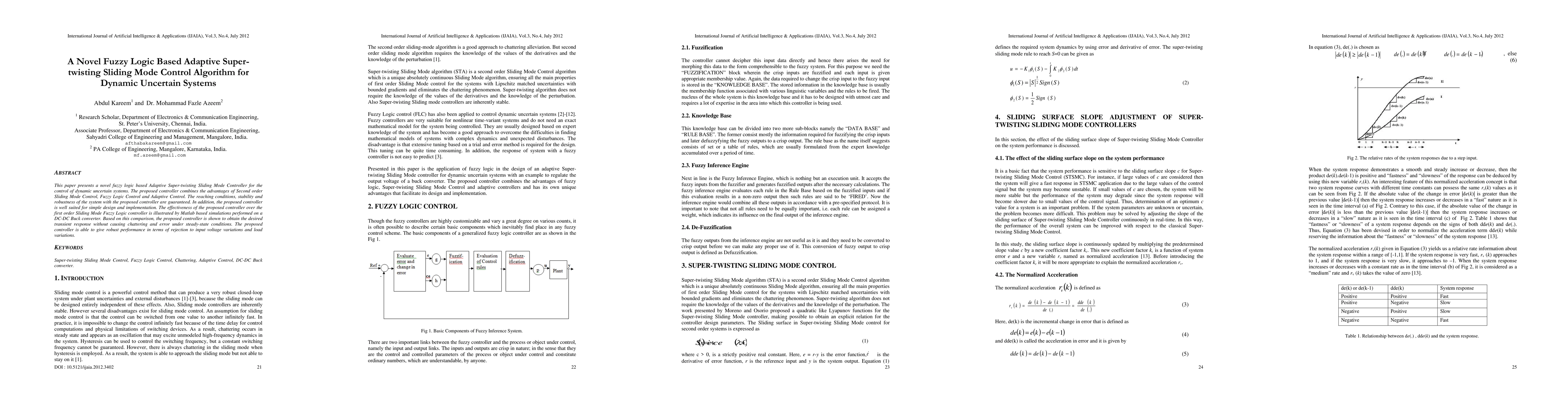 This paper presents a novel fuzzy logic based Adaptive Super-twisting Sliding Mode Controller for the control of dynamic uncertain systems. The proposed controller combines the advantages of Second order Sliding Mode Control, Fuzzy Logic Control and Adaptive Control. The reaching conditions, stability and robustness of the system with the proposed controller are guaranteed. In addition, the proposed controller is well suited for simple design and implementation. The effectiveness of the proposed controller over the first order Sliding Mode Fuzzy Logic controller is illustrated by Matlab based simulations performed on a DC-DC Buck converter. Based on this comparison, the proposed controller is shown to obtain the desired transient response without causing chattering and error under steady-state conditions. The proposed controller is able to give robust performance in terms of rejection to input voltage variations and load variations.