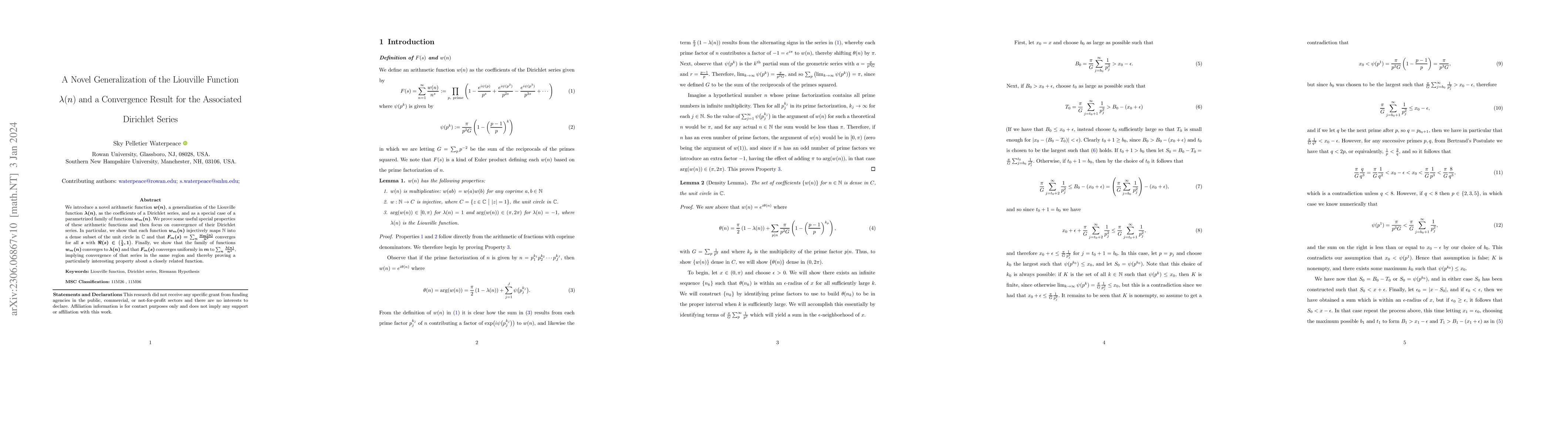 We introduce a novel arithmetic function $w(n)$, a generalization of the Liouville function $\lambda(n)$, as the coefficients of a Dirichlet series, and as a special case of a parametrized family of functions $w_m(n)$. We prove some useful special properties of these arithmetic functions and then focus on convergence of their Dirichlet series. In particular, we show that each function $w_m(n)$ injectively maps $\mathbb{N}$ into a dense subset of the unit circle in $\mathbb{C}$ and that $F_m(s) = \sum_n \frac{w_m(n)}{n^s}$ converges for all $s$ with $\Re(s)\in\left(\frac{1}{2},1\right)$. Finally, we show that the family of functions $w_m(n)$ converges to $\lambda(n)$ and that $F_m(s)$ converges uniformly in $m$ to $\sum_n \frac{\lambda(n)}{n^s}$, implying convergence of that series in the same region and thereby proving a particularly interesting property about a closely related function.