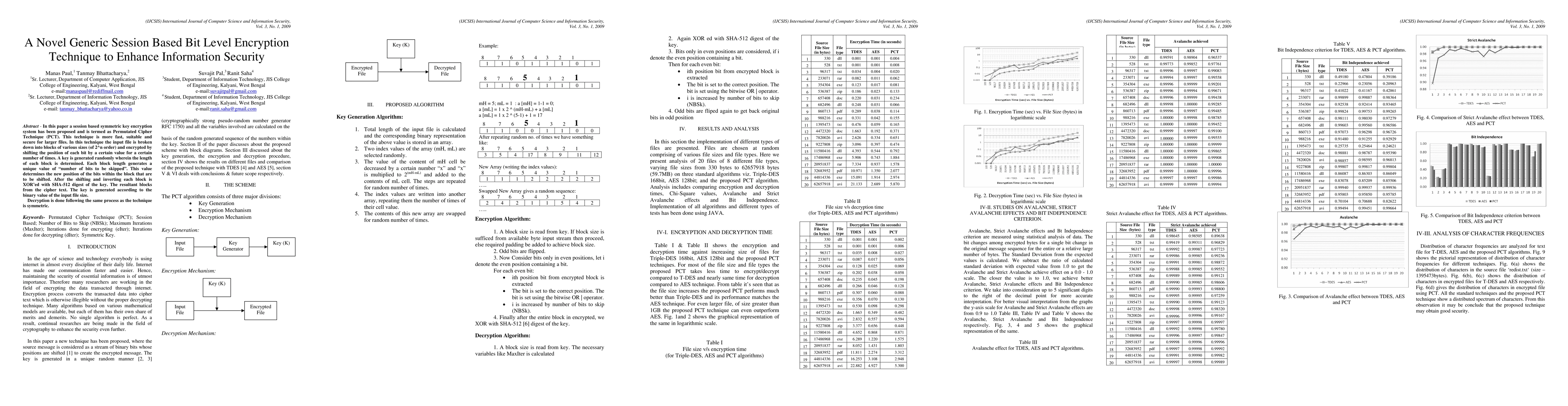 - In this paper a session based symmetric key encryption system has been proposed and is termed as Permutated Cipher Technique (PCT). This technique is more fast, suitable and secure for larger files. In this technique the input file is broken down into blocks of various sizes (of 2 power n order) and encrypted by shifting the position of each bit by a certain value for a certain number of times. A key is generated randomly wherein the length of each block is determined. Each block length generates a unique value of number of bits to be skipped. This value determines the new position of the bits within the block that are to be shifted. After the shifting and inverting each block is XORed with SHA 512 digest of the key. The resultant blocks from the cipher text. The key is generated according to the binary value of the input file size. Decryption is done following the same process as the technique is symmetric.