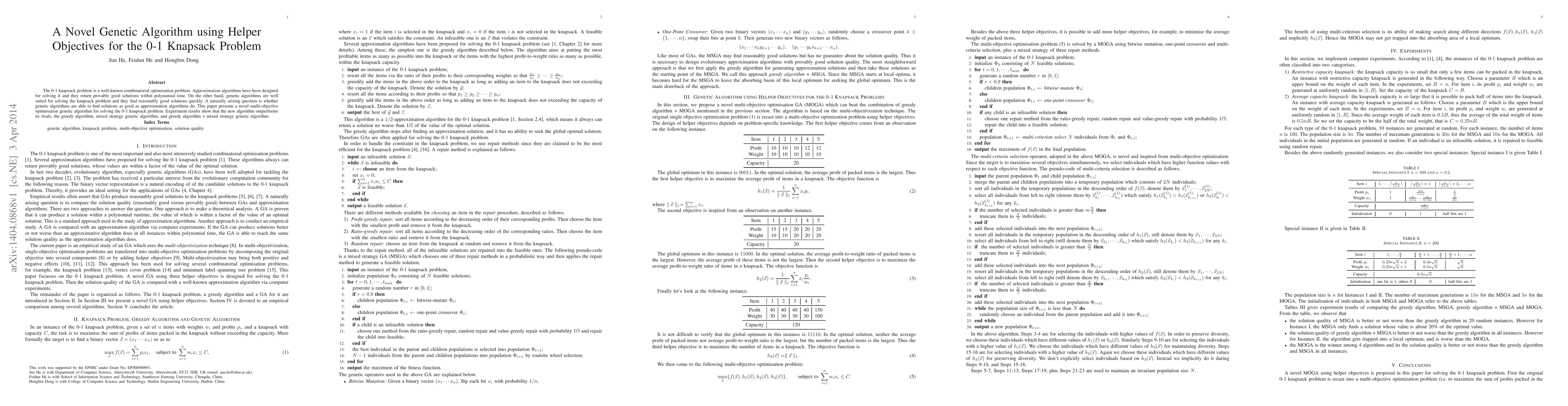 This paper introduces a novel genetic algorithm using helper objectives to solve the 0-1 knapsack problem, demonstrating superior performance compared to greedy, mixed strategy genetic, and combined approaches. Experimental results highlight the algorithm's effectiveness in finding high-quality solutions quickly.