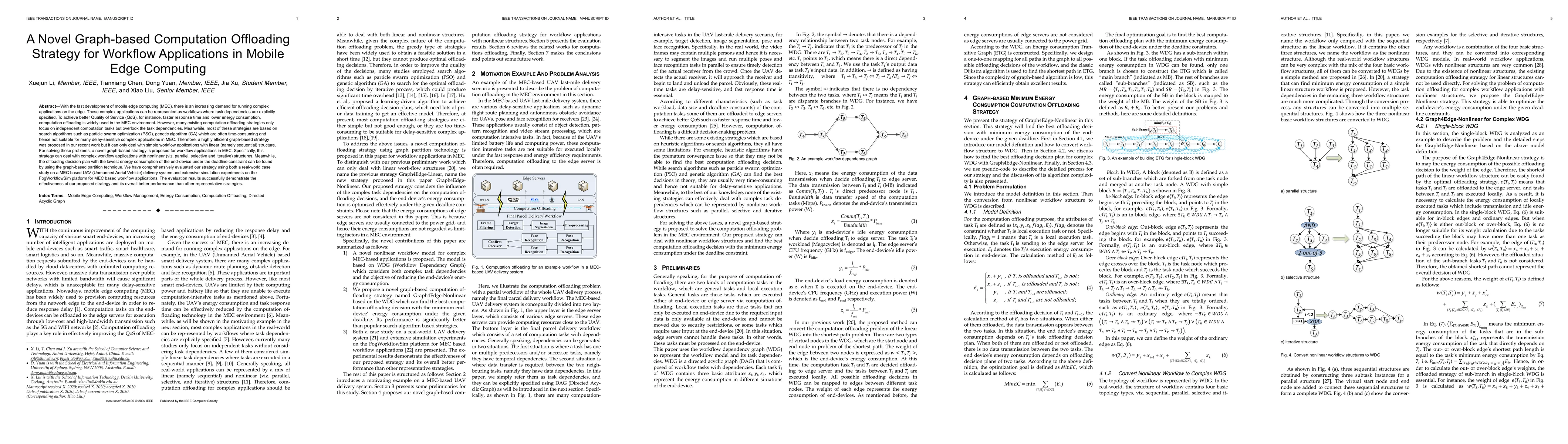 This paper proposes a novel graph-based computation offloading strategy for complex workflow applications in mobile edge computing, addressing task dependencies and nonlinear structures. The strategy efficiently finds the optimal offloading plan for minimizing energy consumption while meeting deadlines, demonstrated through real-world and simulated evaluations.