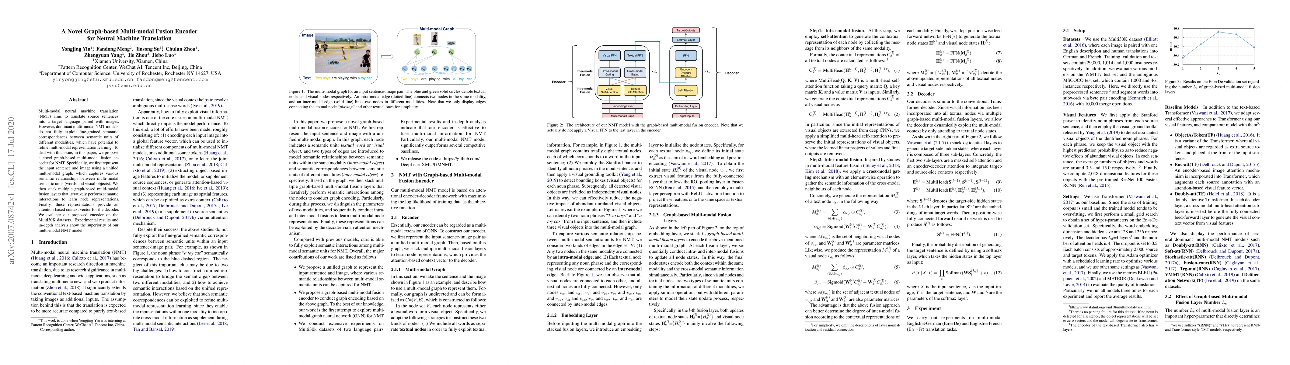 This paper proposes a novel graph-based multi-modal fusion encoder for neural machine translation that captures semantic relationships between words and visual objects. The encoder iteratively refines multi-modal representations through graph-based fusion layers, leading to improved translation performance on the Multi30K dataset.