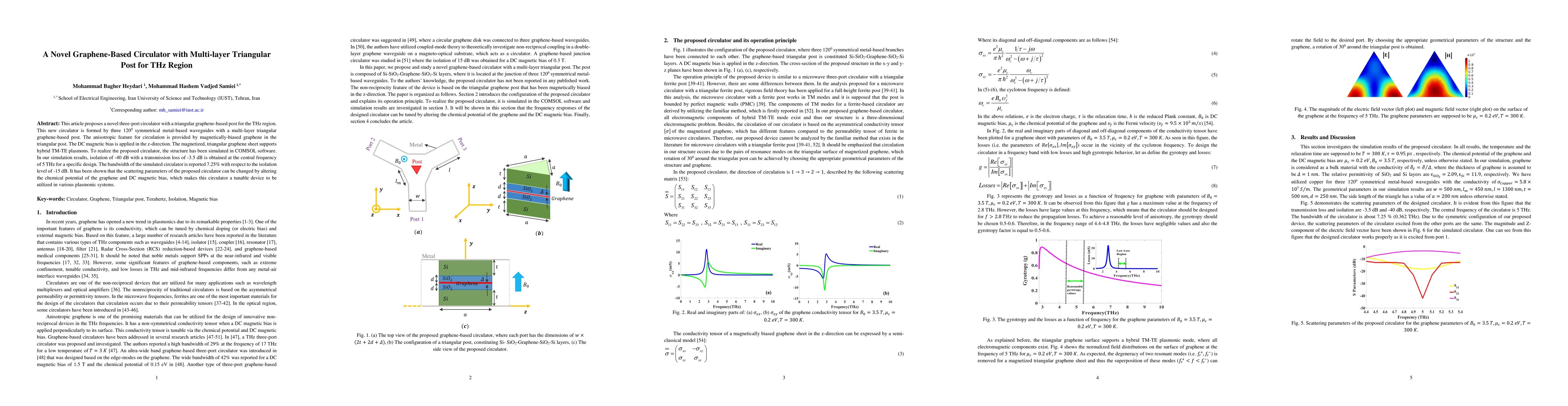 This article proposes a novel three-port circulator with a triangular graphene-based post for the THz region. This new circulator is formed by three 120 symmetrical metal-based waveguides with a multi-layer triangular graphene-based post. The anisotropic feature for circulation is provided by magnetically-biased graphene in the triangular post. The DC magnetic bias is applied in the z-direction. The magnetized, triangular graphene sheet supports hybrid TM-TE plasmons. To realize the proposed circulator, the structure has been simulated in COMSOL software. In our simulation results, isolation of -40 dB with a transmission loss of -3.5 dB is obtained at the central frequency of 5 THz for a specific design. The bandwidth of the simulated circulator is reported 7.25% with respect to the isolation level of -15 dB. It has been shown that the scattering parameters of the proposed circulator can be changed by altering the chemical potential of the graphene and DC magnetic bias, which makes this circulator a tunable device to be utilized in various plasmonic systems.