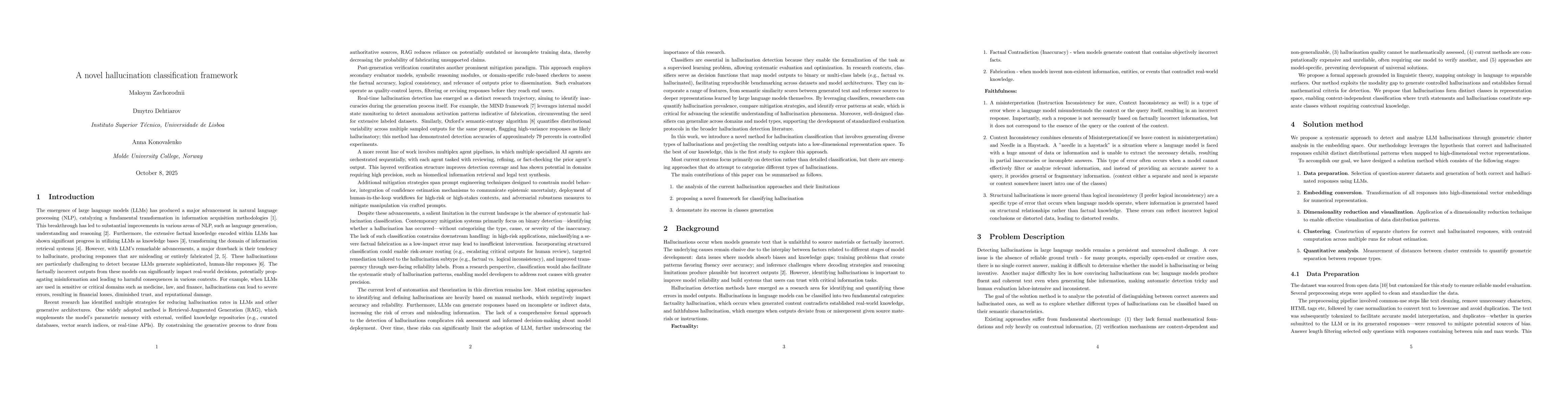 The technical contribution lies in the systematic mapping of hallucinations into a vector space using embeddings, combined with UMAP for visualization and centroid-based distance analysis to classify hallucinations.