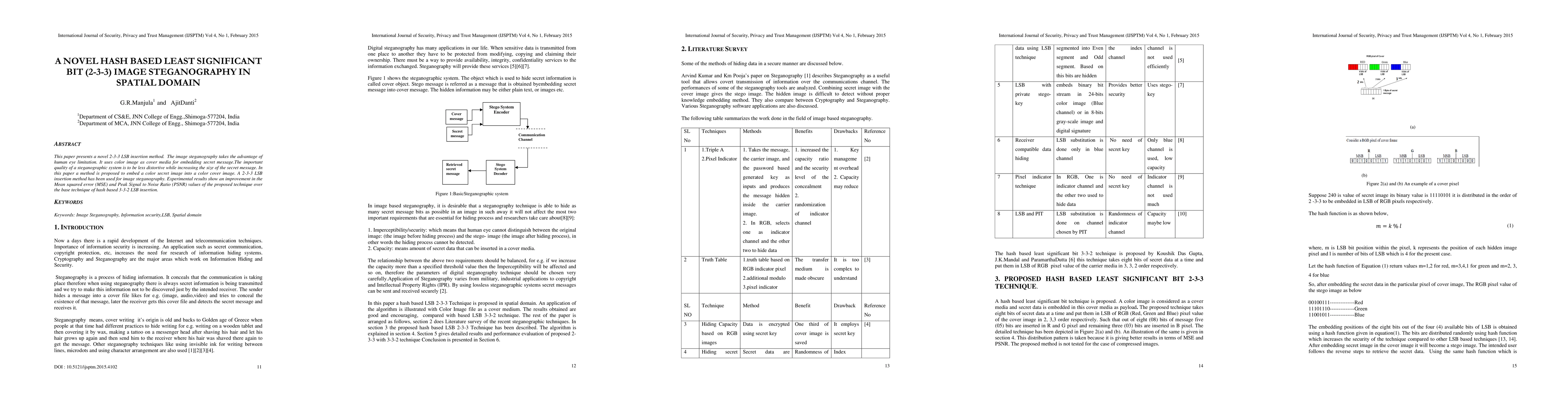 This paper presents a novel 2-3-3 LSB insertion method. The image steganography takes the advantage of human eye limitation. It uses color image as cover media for embedding secret message.The important quality of a steganographic system is to be less distortive while increasing the size of the secret message. In this paper a method is proposed to embed a color secret image into a color cover image. A 2-3-3 LSB insertion method has been used for image steganography. Experimental results show an improvement in the Mean squared error (MSE) and Peak Signal to Noise Ratio (PSNR) values of the proposed technique over the base technique of hash based 3-3-2 LSB insertion.