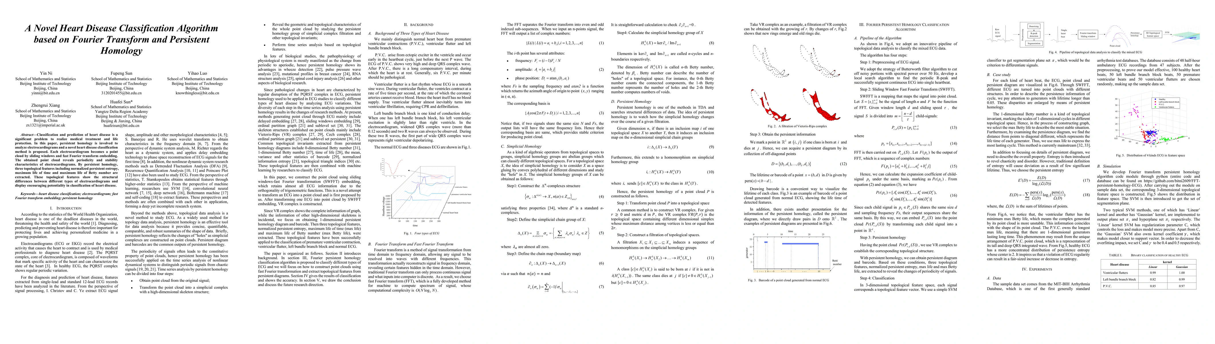 This paper proposes a novel heart disease classification algorithm using Fourier Transform and persistent homology to analyze electrocardiograms. It extracts topological features from point clouds derived from ECGs, showing promising results in classifying different types of heart diseases.