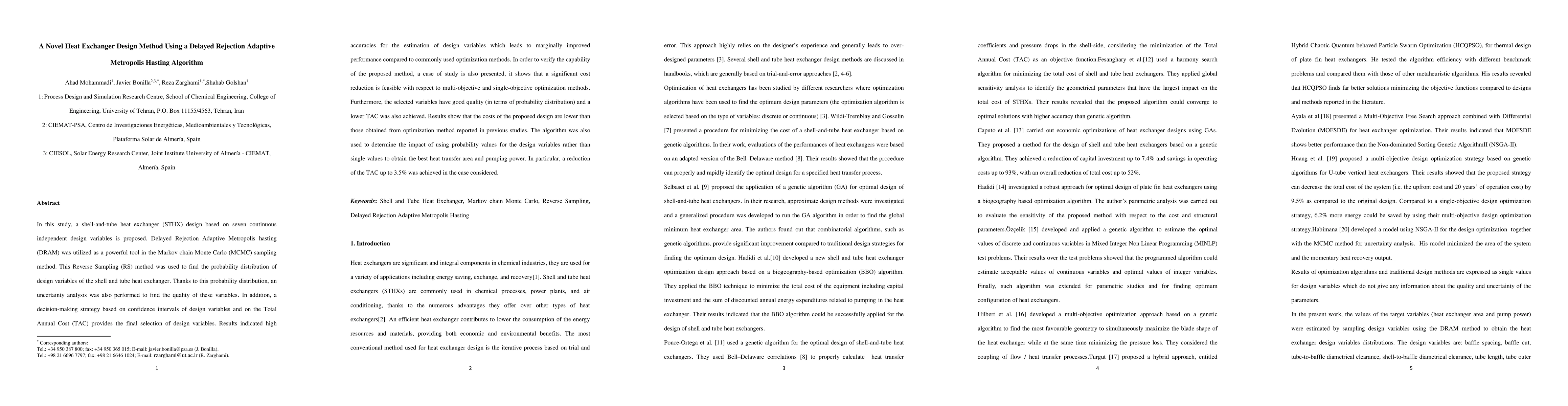 In this study, a shell-and-tube heat exchanger (STHX) design based on seven continuous independent design variables is proposed. Delayed Rejection Adaptive Metropolis hasting (DRAM) was utilized as a powerful tool in the Markov chain Monte Carlo (MCMC) sampling method. This Reverse Sampling (RS) method was used to find the probability distribution of design variables of the shell and tube heat exchanger. Thanks to this probability distribution, an uncertainty analysis was also performed to find the quality of these variables. In addition, a decision-making strategy based on confidence intervals of design variables and on the Total Annual Cost (TAC) provides the final selection of design variables. Results indicated high accuracies for the estimation of design variables which leads to marginally improved performance compared to commonly used optimization methods. In order to verify the capability of the proposed method, a case of study is also presented, it shows that a significant cost reduction is feasible with respect to multi-objective and single-objective optimization methods. Furthermore, the selected variables have good quality (in terms of probability distribution) and a lower TAC was also achieved. Results show that the costs of the proposed design are lower than those obtained from optimization method reported in previous studies. The algorithm was also used to determine the impact of using probability values for the design variables rather than single values to obtain the best heat transfer area and pumping power. In particular, a reduction of the TAC up to 3.5% was achieved in the case considered.