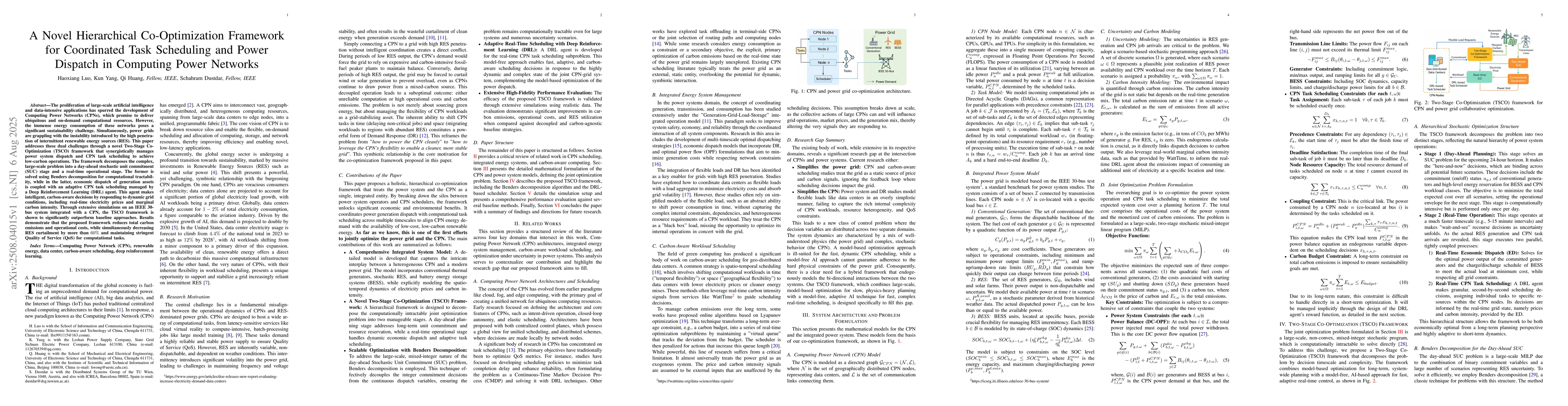The proliferation of large-scale artificial intelligence and data-intensive applications has spurred the development of Computing Power Networks (CPNs), which promise to deliver ubiquitous and on-demand computational resources. However, the immense energy consumption of these networks poses a significant sustainability challenge. Simultaneously, power grids are grappling with the instability introduced by the high penetration of intermittent renewable energy sources (RES). This paper addresses these dual challenges through a novel Two-Stage Co-Optimization (TSCO) framework that synergistically manages power system dispatch and CPN task scheduling to achieve low-carbon operations. The framework decomposes the complex, large-scale problem into a day-ahead stochastic unit commitment (SUC) stage and a real-time operational stage. The former is solved using Benders decomposition for computational tractability, while in the latter, economic dispatch of generation assets is coupled with an adaptive CPN task scheduling managed by a Deep Reinforcement Learning (DRL) agent. This agent makes intelligent, carbon-aware decisions by responding to dynamic grid conditions, including real-time electricity prices and marginal carbon intensity. Through extensive simulations on an IEEE 30-bus system integrated with a CPN, the TSCO framework is shown to significantly outperform baseline approaches. Results demonstrate that the proposed framework reduces total carbon emissions and operational costs, while simultaneously decreasing RES curtailment by more than 60% and maintaining stringent Quality of Service (QoS) for computational tasks.