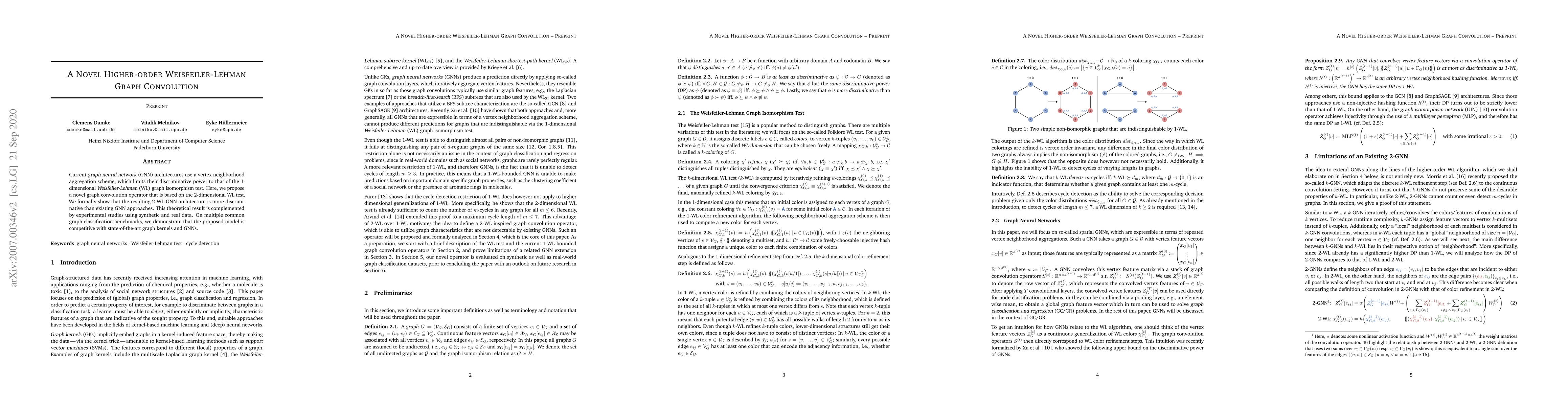 Current GNN architectures use a vertex neighborhood aggregation scheme, which limits their discriminative power to that of the 1-dimensional Weisfeiler-Lehman (WL) graph isomorphism test. Here, we propose a novel graph convolution operator that is based on the 2-dimensional WL test. We formally show that the resulting 2-WL-GNN architecture is more discriminative than existing GNN approaches. This theoretical result is complemented by experimental studies using synthetic and real data. On multiple common graph classification benchmarks, we demonstrate that the proposed model is competitive with state-of-the-art graph kernels and GNNs.