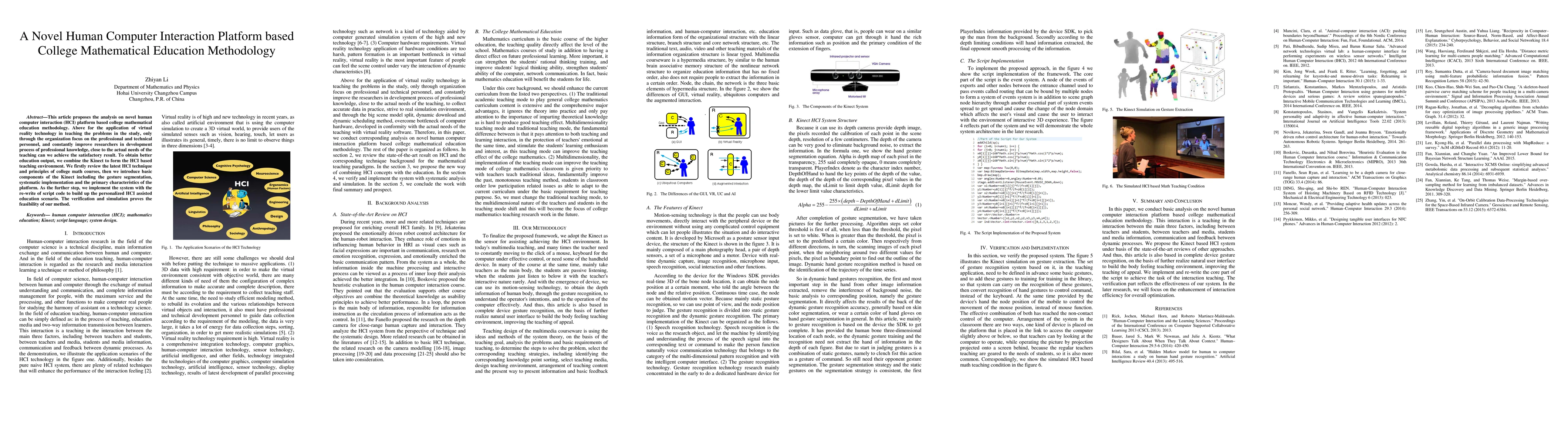 This article proposes the analysis on novel human computer interaction (HCI) platform based college mathematical education methodology. Above for the application of virtual reality technology in teaching the problems in the study, only through the organization focus on the professional and technical personnel, and constantly improve researchers in development process of professional knowledge, close to the actual needs of the teaching can we achieve the satisfactory result. To obtain better education output, we combine the Kinect to form the HCI based teaching environment. We firstly review the latest HCI technique and principles of college math courses, then we introduce basic components of the Kinect including the gesture segmentation, systematic implementation and the primary characteristics of the platform. As the further step, we implement the system with the re-write of script code to build up the personalized HCI assisted education scenario. The verification and simulation proves the feasibility of our method.