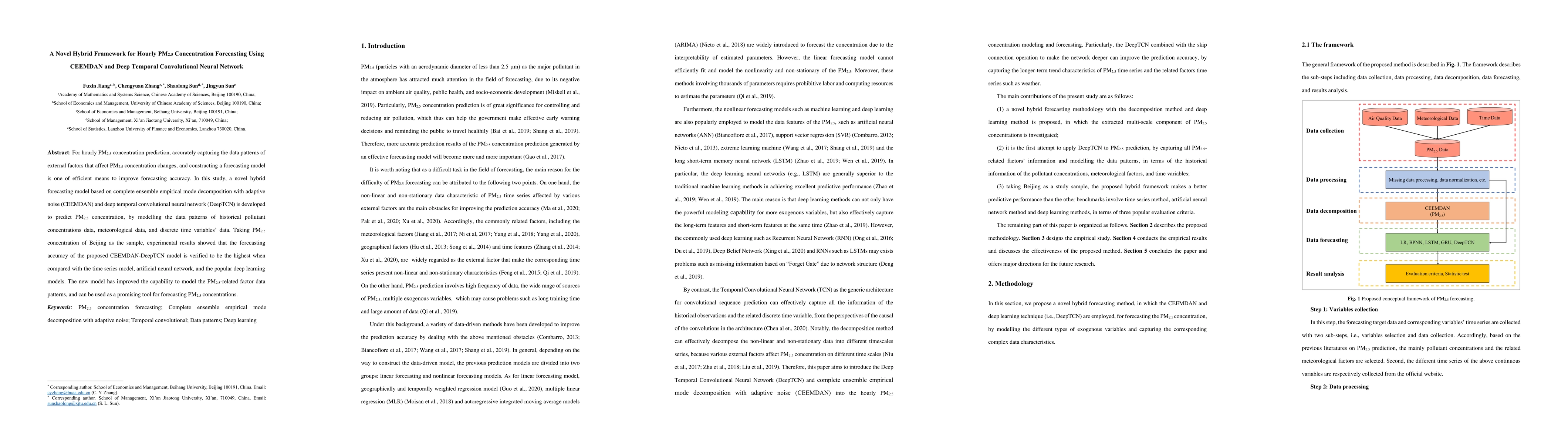 This paper proposes a hybrid CEEMDAN-DeepTCN model for hourly PM2.5 concentration forecasting, integrating complete ensemble empirical mode decomposition with adaptive noise and deep temporal convolutional neural networks. Experimental results demonstrate superior forecasting accuracy compared to traditional and deep learning models, indicating its potential for accurate PM2.5 concentration predictions.