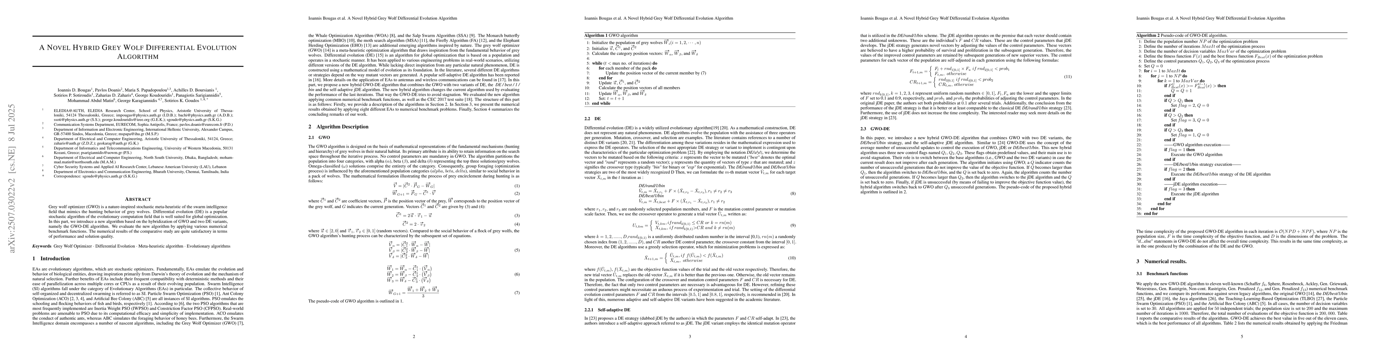 Grey wolf optimizer (GWO) is a nature-inspired stochastic meta-heuristic of the swarm intelligence field that mimics the hunting behavior of grey wolves. Differential evolution (DE) is a popular stochastic algorithm of the evolutionary computation field that is well suited for global optimization. In this part, we introduce a new algorithm based on the hybridization of GWO and two DE variants, namely the GWO-DE algorithm. We evaluate the new algorithm by applying various numerical benchmark functions. The numerical results of the comparative study are quite satisfactory in terms of performance and solution quality.