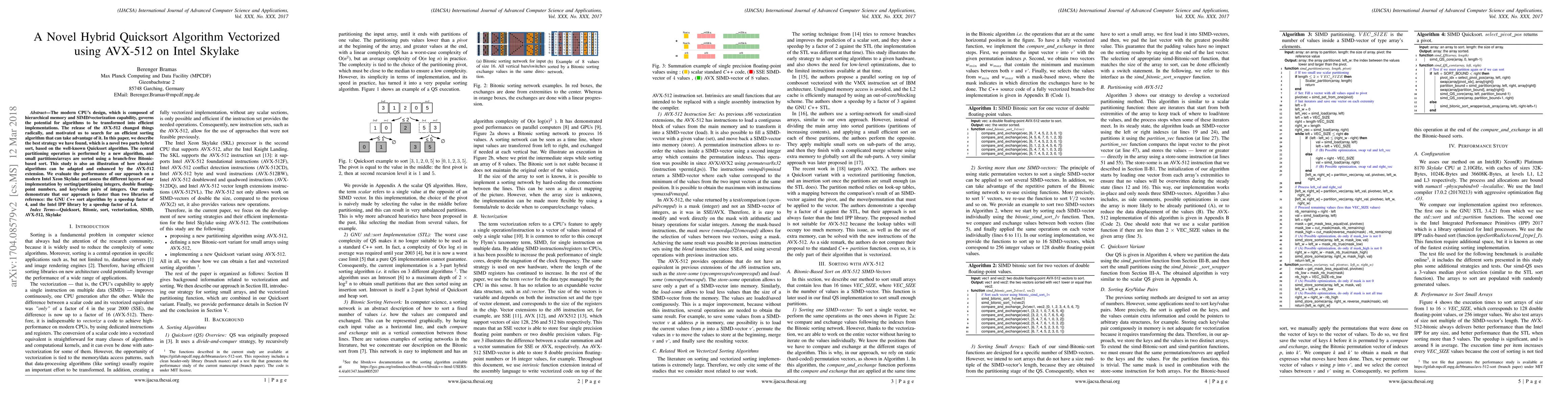 This paper presents a novel hybrid Quicksort algorithm vectorized using AVX-512 on Intel Skylake CPUs, combining a new partitioning method with a branch-free Bitonic sort for small partitions. The implementation outperforms the GNU C++ sort and Intel IPP library by factors of 4 and 1.4 respectively.