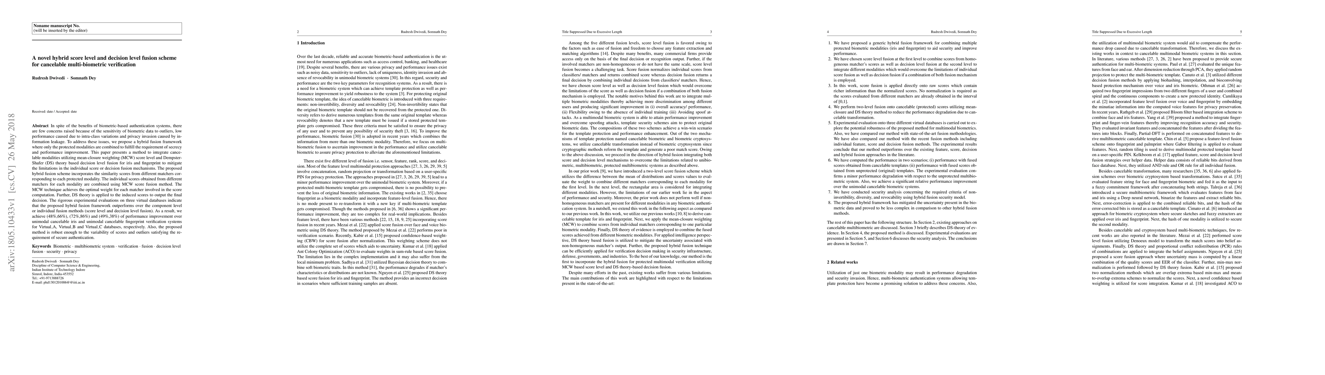 This paper proposes a novel hybrid fusion framework for cancelable multi-biometric verification using mean-closure weighting (MCW) score level fusion and Dempster-Shafer (DS) theory-based decision level fusion to enhance performance and security. Experimental results show significant improvements over unimodal systems, achieving up to 86% better performance across three virtual databases.
