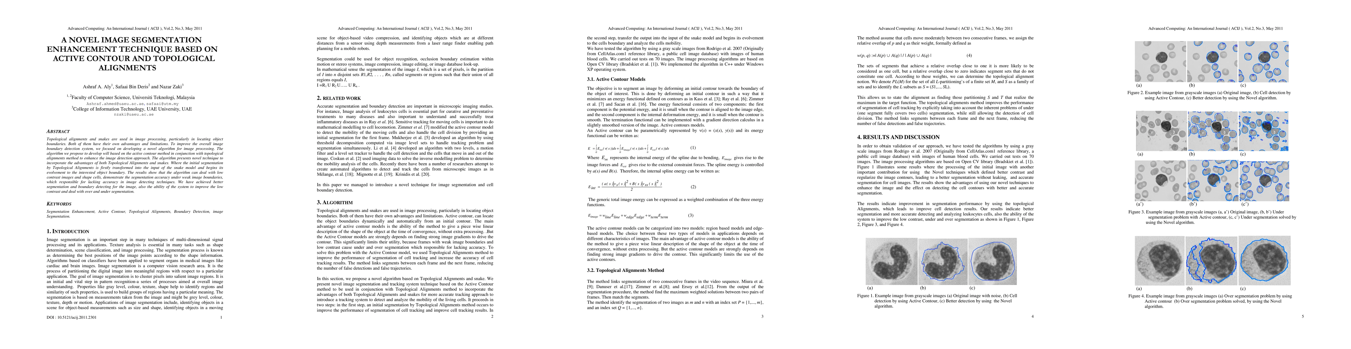 Topological alignments and snakes are used in image processing, particularly in locating object boundaries. Both of them have their own advantages and limitations. To improve the overall image boundary detection system, we focused on developing a novel algorithm for image processing. The algorithm we propose to develop will based on the active contour method in conjunction with topological alignments method to enhance the image detection approach. The algorithm presents novel technique to incorporate the advantages of both Topological Alignments and snakes. Where the initial segmentation by Topological Alignments is firstly transformed into the input of the snake model and begins its evolvement to the interested object boundary. The results show that the algorithm can deal with low contrast images and shape cells, demonstrate the segmentation accuracy under weak image boundaries, which responsible for lacking accuracy in image detecting techniques. We have achieved better segmentation and boundary detecting for the image, also the ability of the system to improve the low contrast and deal with over and under segmentation.