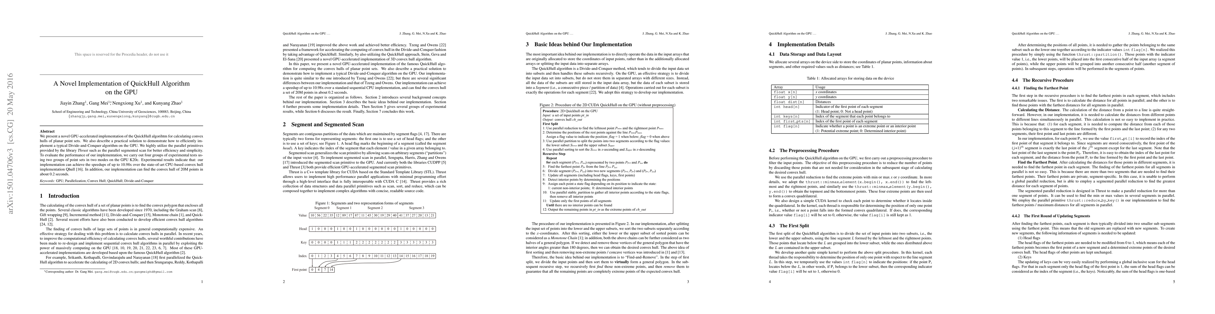 We present a novel GPU-accelerated implementation of the QuickHull algorihtm for calculating convex hulls of planar point sets. We also describe a practical solution to demonstrate how to efficiently implement a typical Divide-and-Conquer algorithm on the GPU. We highly utilize the parallel primitives provided by the library Thrust such as the parallel segmented scan for better efficiency and simplicity. To evaluate the performance of our implementation, we carry out four groups of experimental tests using two groups of point sets in two modes on the GPU K20c. Experimental results indicate that: our implementation can achieve the speedups of up to 10.98x over the state-of-art CPU-based convex hull implementation Qhull [16]. In addition, our implementation can find the convex hull of 20M points in about 0.2 seconds.