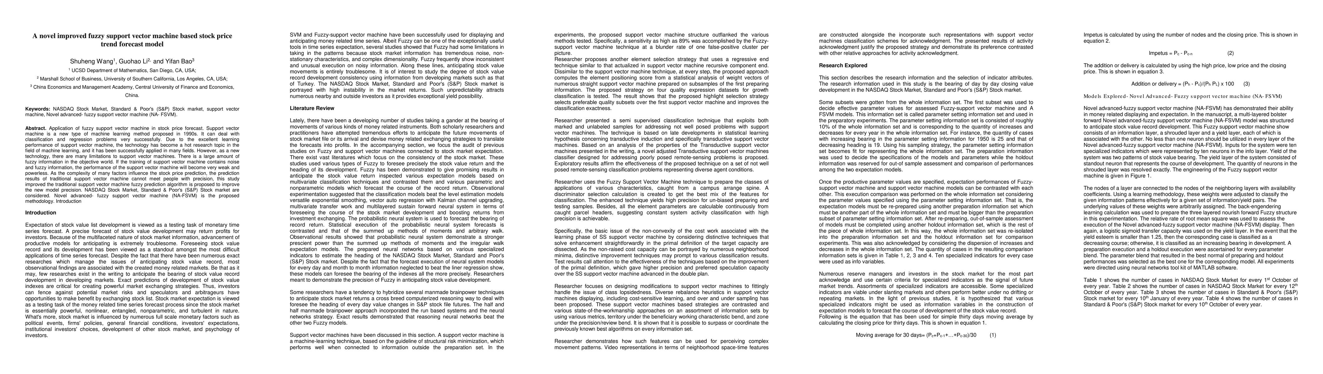 Application of fuzzy support vector machine in stock price forecast. Support vector machine is a new type of machine learning method proposed in 1990s. It can deal with classification and regression problems very successfully. Due to the excellent learning performance of support vector machine, the technology has become a hot research topic in the field of machine learning, and it has been successfully applied in many fields. However, as a new technology, there are many limitations to support vector machines. There is a large amount of fuzzy information in the objective world. If the training of support vector machine contains noise and fuzzy information, the performance of the support vector machine will become very weak and powerless. As the complexity of many factors influence the stock price prediction, the prediction results of traditional support vector machine cannot meet people with precision, this study improved the traditional support vector machine fuzzy prediction algorithm is proposed to improve the new model precision. NASDAQ Stock Market, Standard & Poor's (S&P) Stock market are considered. Novel advanced- fuzzy support vector machine (NA-FSVM) is the proposed methodology.
