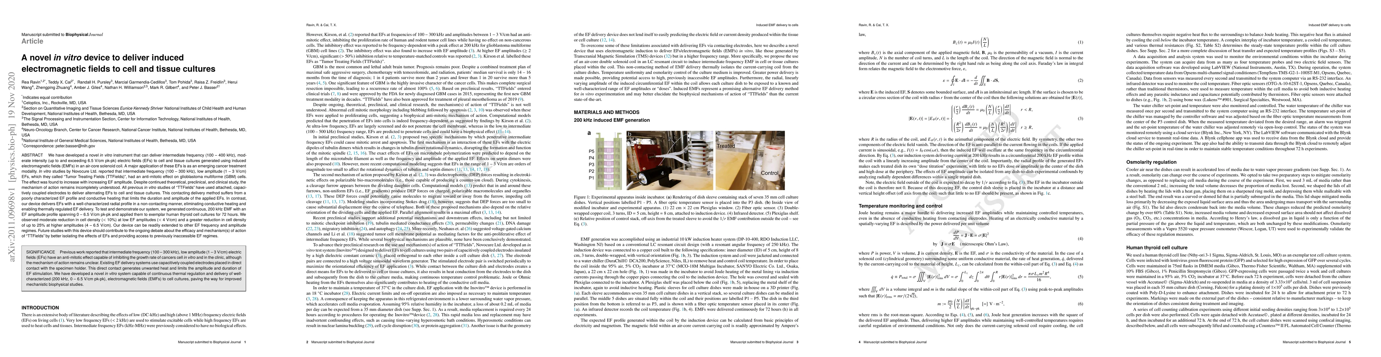 This paper introduces a new in vitro device that delivers induced electromagnetic fields to cell and tissue cultures, offering a non-contacting method with a well-characterized radial profile, which can deliver moderate intensity electric fields up to 6.5 V/cm pk-pk. The device aims to better study the effects of intermediate frequency electric fields, potentially enhancing understanding of their anti-mitotic effects on cancer cells, such as glioblastoma multiforme.