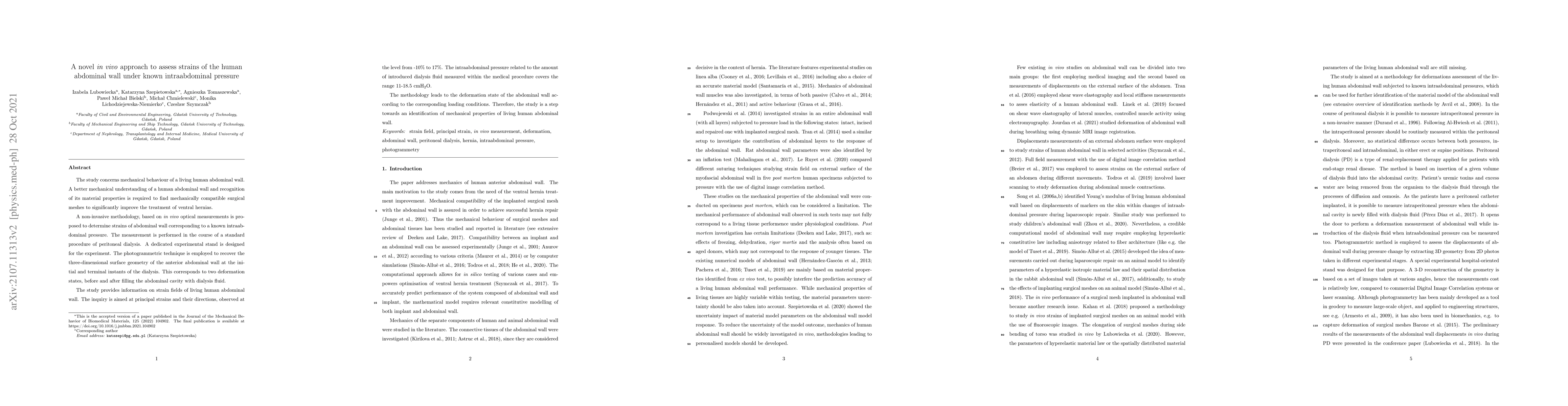 The study concerns mechanical behaviour of a living human abdominal wall. A better mechanical understanding of a human abdominal wall and recognition of its material properties is required to find mechanically compatible surgical meshes to significantly improve the treatment of ventral hernias. A non-invasive methodology, based on in vivo optical measurements is proposed to determine strains of abdominal wall corresponding to a known intraabdominal pressure. The measurement is performed in the course of a standard procedure of peritoneal dialysis. A dedicated experimental stand is designed for the experiment. The photogrammetric technique is employed to recover the three-dimensional surface geometry of the anterior abdominal wall at the initial and terminal instants of the dialysis. This corresponds to two deformation states, before and after filling the abdominal cavity with dialysis fluid. The study provides information on strain fields of living human abdominal wall. The inquiry is aimed at principal strains and their directions, observed at the level from -10% to 17%. The intraabdominal pressure related to the amount of introduced dialysis fluid measured within the medical procedure covers the range 11-18.5 cmH$_2$O. The methodology leads to the deformation state of the abdominal wall according to the corresponding loading conditions. Therefore, the study is a step towards an identification of mechanical properties of living human abdominal wall.