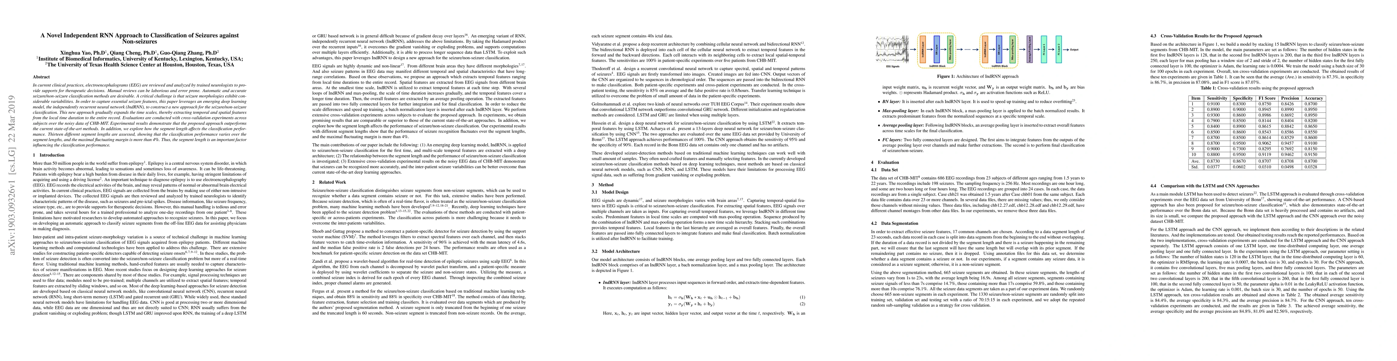 In current clinical practices, electroencephalograms (EEG) are reviewed and analyzed by trained neurologists to provide supports for therapeutic decisions. Manual reviews can be laborious and error prone. Automatic and accurate seizure/non-seizure classification methods are desirable. A critical challenge is that seizure morphologies exhibit considerable variabilities. In order to capture essential seizure features, this paper leverages an emerging deep learning model, the independently recurrent neural network (IndRNN), to construct a new approach for the seizure/non-seizure classification. This new approach gradually expands the time scales, thereby extracting temporal and spatial features from the local time duration to the entire record. Evaluations are conducted with cross-validation experiments across subjects over the noisy data of CHB-MIT. Experimental results demonstrate that the proposed approach outperforms the current state-of-the-art methods. In addition, we explore how the segment length affects the classification performance. Thirteen different segment lengths are assessed, showing that the classification performance varies over the segment lengths, and the maximal fluctuating margin is more than 4%. Thus, the segment length is an important factor influencing the classification performance.