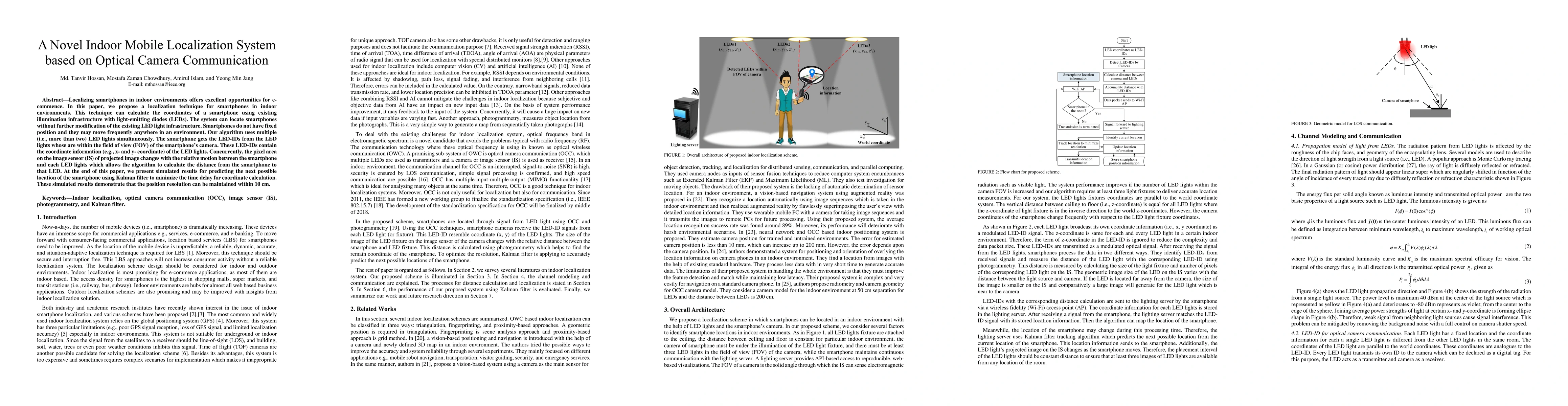 This paper presents a novel indoor smartphone localization system using existing LED lighting and a smartphone camera. The method involves capturing LED-IDs and pixel area changes in the camera's view to calculate the smartphone's coordinates without altering the current LED setup.
