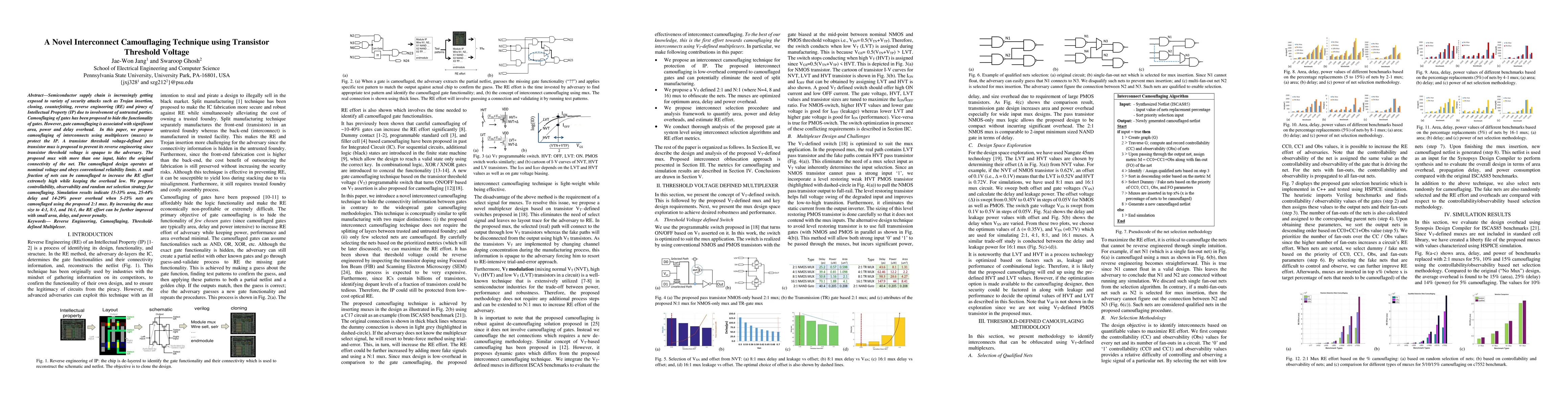 This work distinguishes itself by focusing on interconnect camouflaging rather than gate camouflaging, and by utilizing transistor threshold voltages to create opaque multiplexers for increased reverse engineering effort.