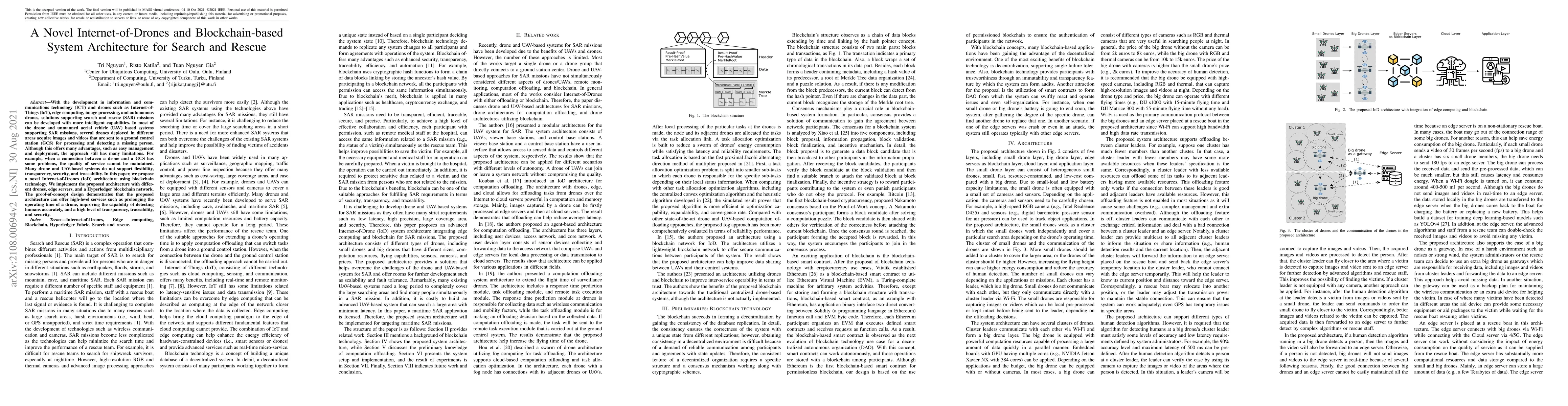 With the development in information and communications technology (ICT) and drones such as Internet-of-Things (IoT), edge computing, image processing, and autonomous drones, solutions supporting search and rescue (SAR) missions can be developed with more intelligent capabilities. In most of the drone and unmanned aerial vehicle (UAV) based systems supporting SAR missions, several drones deployed in different areas acquire images and videos that are sent to a ground control station (GCS) for processing and detecting a missing person. Although this offers many advantages, such as easy management and deployment, the approach still has many limitations. For example, when a connection between a drone and a GCS has some problems, the quality of service cannot be maintained. Many drone and UAV-based systems do not support flexibility, transparency, security, and traceability. In this paper, we propose a novel Internet-of-Drones (IoD) architecture using blockchain technology. We implement the proposed architecture with different drones, edge servers, and a Hyperledger blockchain network. The proof-of-concept design demonstrates that the proposed architecture can offer high-level services such as prolonging the operating time of a drone, improving the capability of detecting humans accurately, and a high level of transparency, traceability, and security.
