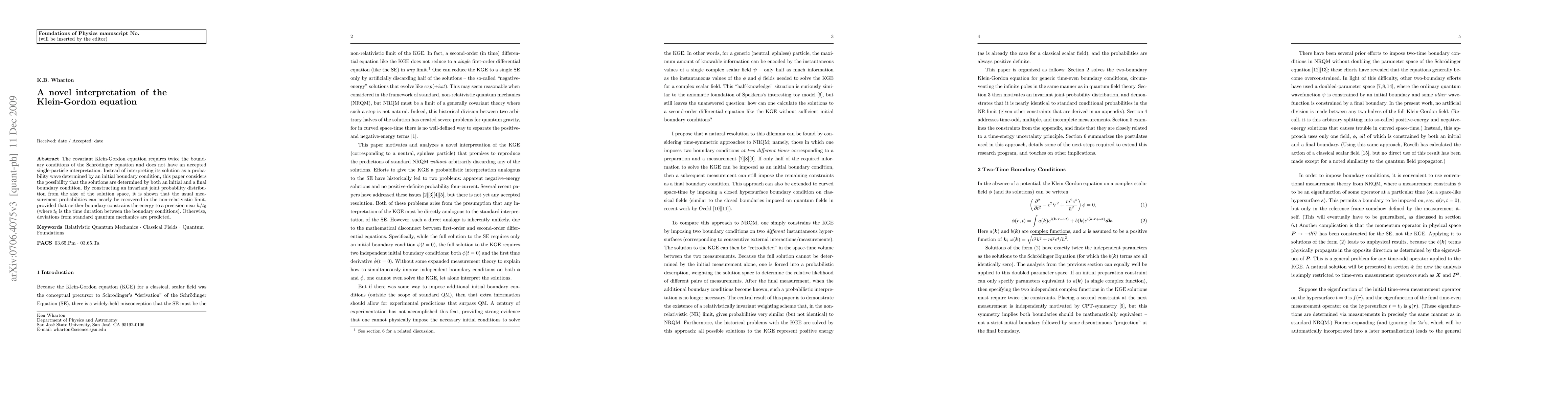 The covariant Klein-Gordon equation requires twice the boundary conditions of the Schrodinger equation and does not have an accepted single-particle interpretation. Instead of interpreting its solution as a probability wave determined by an initial boundary condition, this paper considers the possibility that the solutions are determined by both an initial and a final boundary condition. By constructing an invariant joint probability distribution from the size of the solution space, it is shown that the usual measurement probabilities can nearly be recovered in the non-relativistic limit, provided that neither boundary constrains the energy to a precision near hbar/T (where T is the time duration between the boundary conditions). Otherwise, deviations from standard quantum mechanics are predicted.