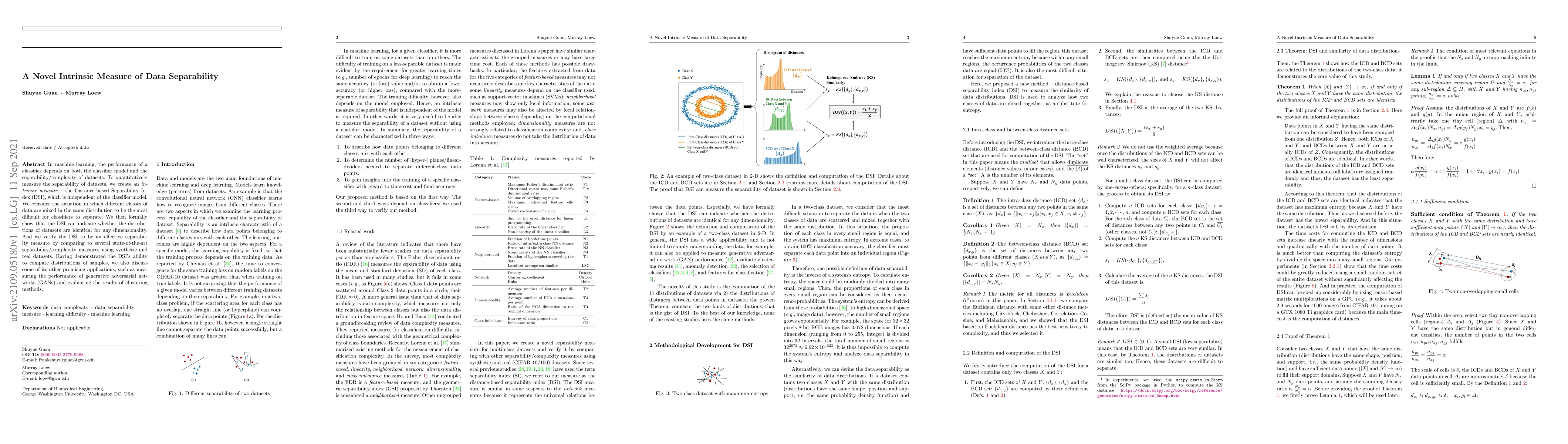 This paper introduces the Distance-based Separability Index (DSI), a novel intrinsic measure to quantify dataset separability independent of the classifier model. The DSI effectively indicates whether datasets have identical distributions across any dimensionality and shows promise in evaluating generative models and clustering results.