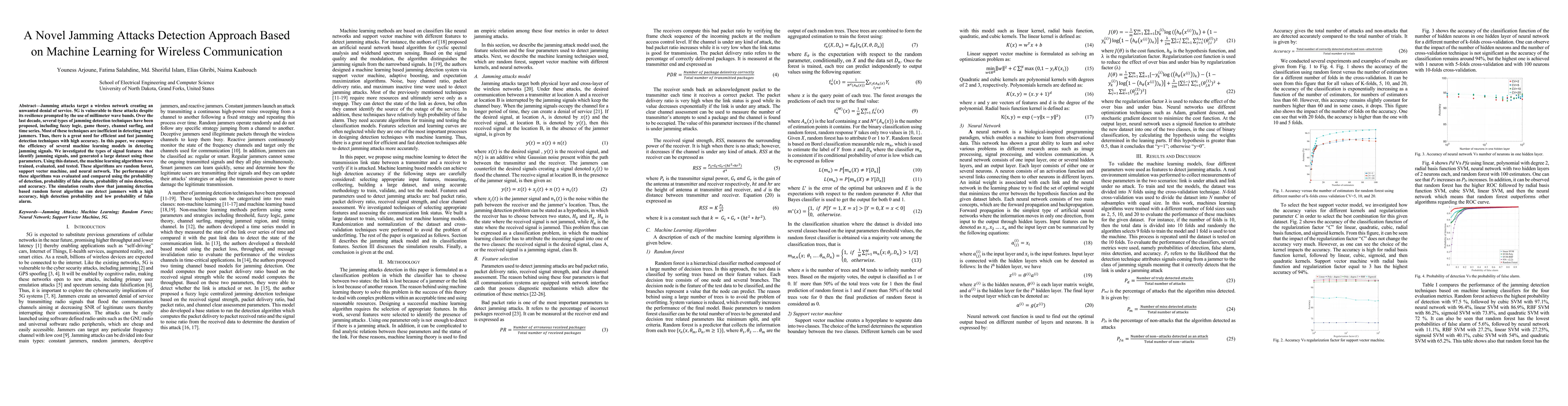 This paper proposes a novel jamming detection approach using machine learning models, specifically random forest, support vector machine, and neural network, to identify jamming attacks in wireless communication. The random forest algorithm demonstrated high accuracy, high detection probability, and low probability of false alarm, outperforming other models.
