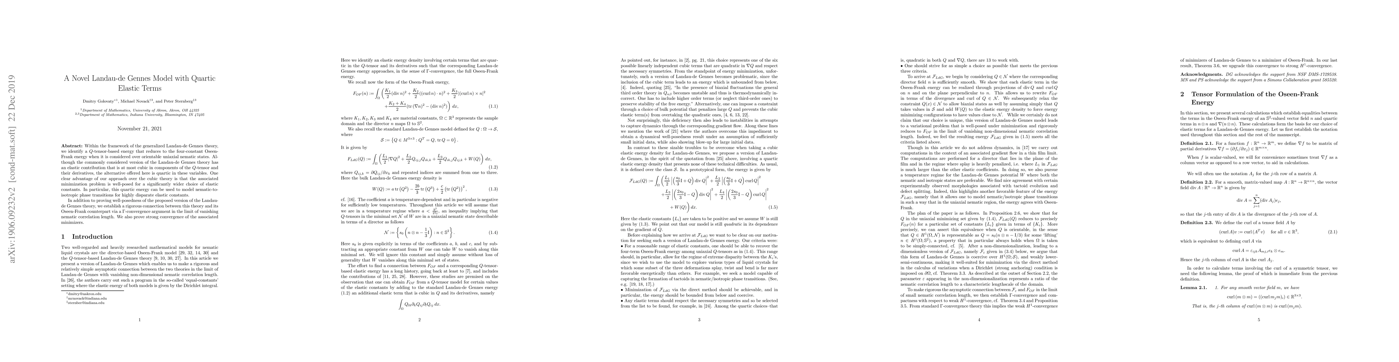 This paper proposes a novel Landau-de Gennes model with quartic elastic terms, offering a wider applicability for nematic-to-isotropic phase transitions compared to the cubic model. It establishes well-posedness and rigorous connections between the quartic model and the traditional Oseen-Frank model through $\Gamma$-convergence.