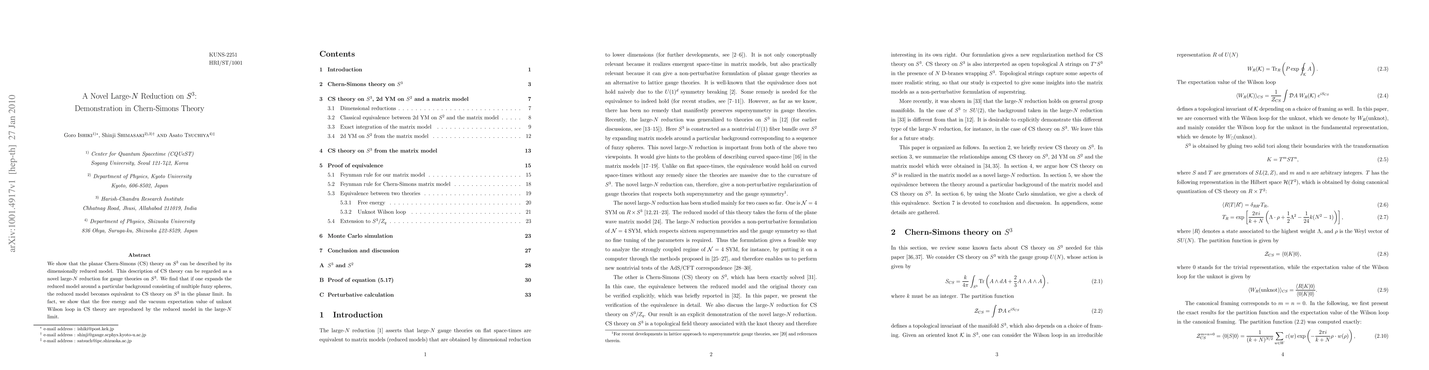 This paper demonstrates a novel large-N reduction for planar Chern-Simons theory on S^3, showing its equivalence to a dimensionally reduced model. The reduced model accurately reproduces the free energy and unknot Wilson loop's vacuum expectation value in the large-N limit.