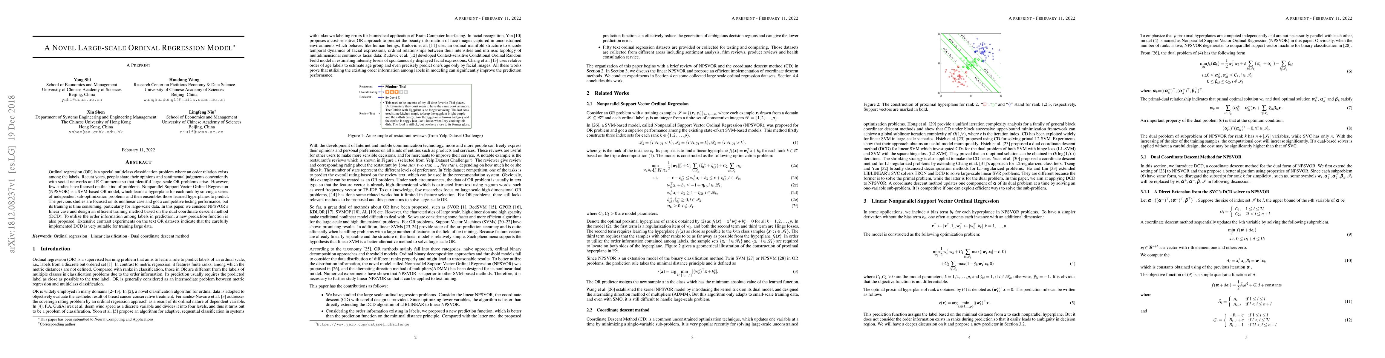Ordinal regression (OR) is a special multiclass classification problem where an order relation exists among the labels. Recent years, people share their opinions and sentimental judgments conveniently with social networks and E-Commerce so that plentiful large-scale OR problems arise. However, few studies have focused on this kind of problems. Nonparallel Support Vector Ordinal Regression (NPSVOR) is a SVM-based OR model, which learns a hyperplane for each rank by solving a series of independent sub-optimization problems and then ensembles those learned hyperplanes to predict. The previous studies are focused on its nonlinear case and got a competitive testing performance, but its training is time consuming, particularly for large-scale data. In this paper, we consider NPSVOR's linear case and design an efficient training method based on the dual coordinate descent method (DCD). To utilize the order information among labels in prediction, a new prediction function is also proposed. Extensive contrast experiments on the text OR datasets indicate that the carefully implemented DCD is very suitable for training large data.