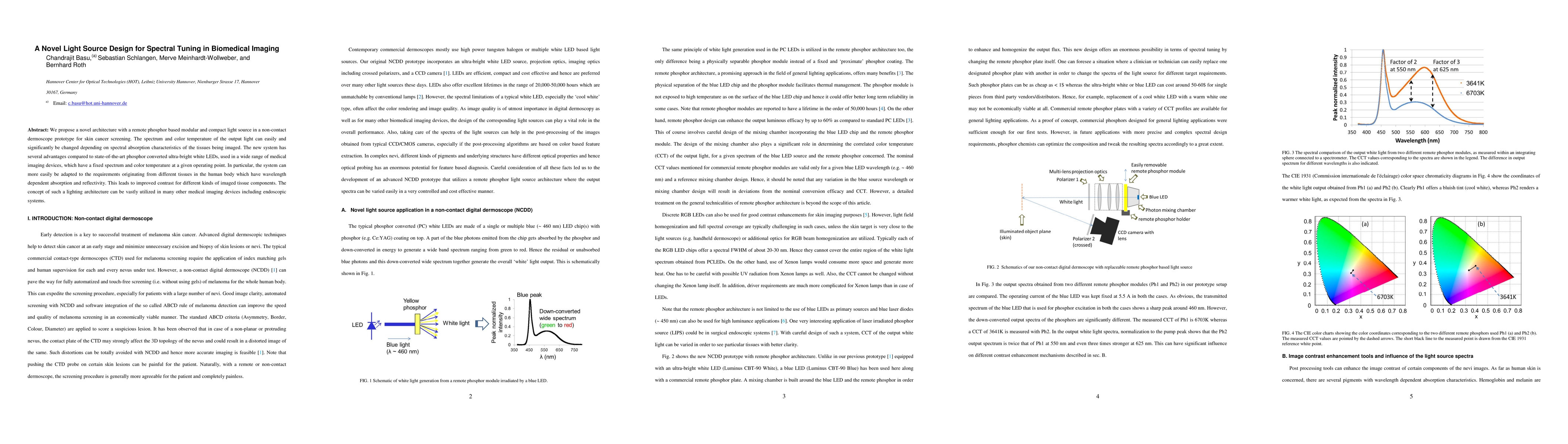 We propose a novel architecture with a remote phosphor based modular and compact light source in a non-contact dermoscope prototype for skin cancer screening. The spectrum and color temperature of the output light can easily and significantly be changed depending on spectral absorption characteristics of the tissues being imaged. The new system has several advantages compared to state-of-the-art phosphor converted ultra-bright white LEDs, used in a wide range of medical imaging devices, which have a fixed spectrum and color temperature at a given operating point. In particular, the system can more easily be adapted to the requirements originating from different tissues in the human body which have wavelength dependent absorption and reflectivity. This leads to improved contrast for different kinds of imaged tissue components. The concept of such a lighting architecture can be vastly utilized in many other medical imaging devices including endoscopic systems.