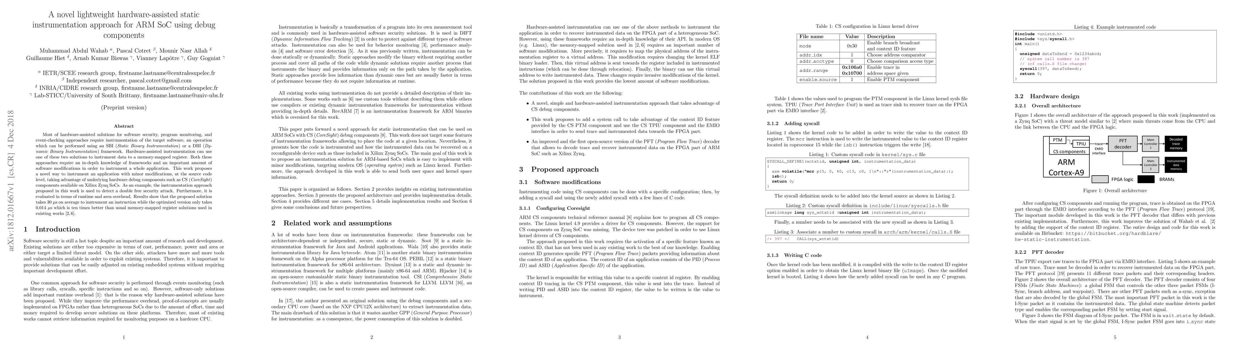 Most of hardware-assisted solutions for software security, program monitoring, and event-checking approaches require instrumentation of the target software, an operation which can be performed using an SBI (Static Binary Instrumentation) or a DBI (Dynamic Binary Instrumentation) framework. Hardware-assisted instrumentation can use one of these two solutions to instrument data to a memory-mapped register. Both these approaches require an in-depth knowledge of frameworks and an important amount of software modifications in order to instrument a whole application. This work proposes a novel way to instrument an application with minor modifications, at the source code level, taking advantage of underlying hardware debug components such as CS (CoreSight) components available on Xilinx Zynq SoCs. As an example, the instrumentation approach proposed in this work is used to detect a double free security attack. Furthermore, it is evaluated in terms of runtime and area overhead. Results show that the proposed solution takes 30 $\mu$s on average to instrument an instruction while the optimized version only takes 0.014 us which is ten times better than usual memory-mapped register solutions used in existing works.