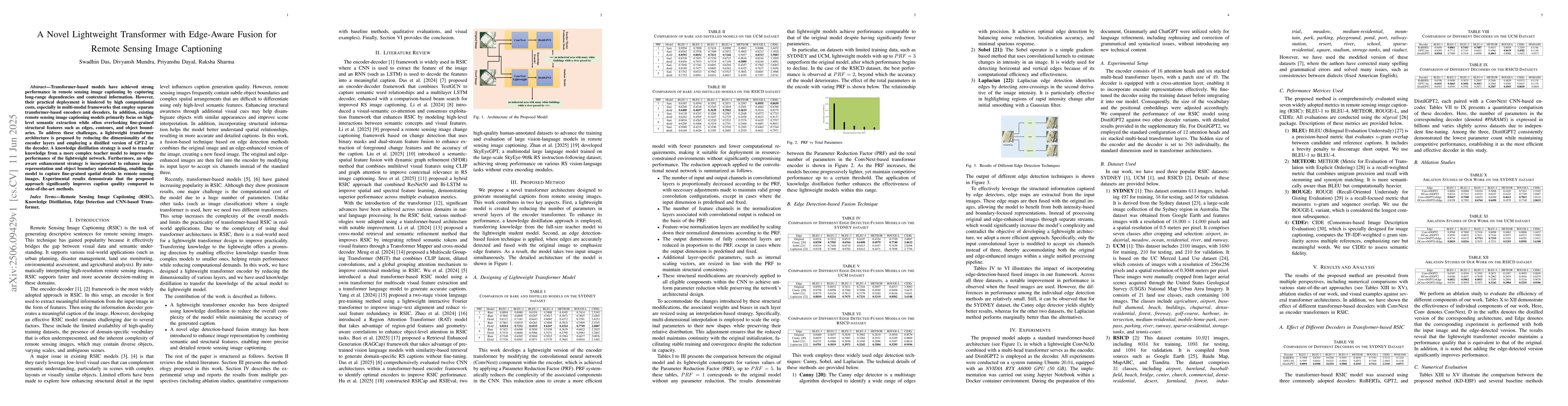A new transformer model is proposed for remote sensing image captioning that balances performance with computational efficiency and improves object boundary understanding through an edge-aware enhancement strategy.
