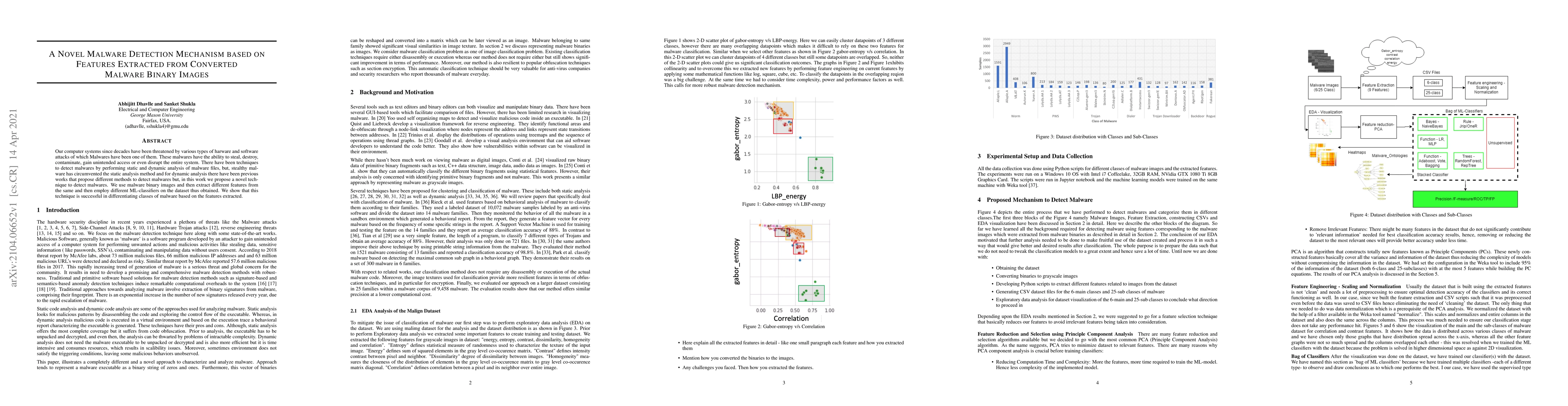 Our computer systems for decades have been threatened by various types of hardware and software attacks of which Malwares have been one of them. This malware has the ability to steal, destroy, contaminate, gain unintended access, or even disrupt the entire system. There have been techniques to detect malware by performing static and dynamic analysis of malware files, but, stealthy malware has circumvented the static analysis method and for dynamic analysis, there have been previous works that propose different methods to detect malware but, in this work we propose a novel technique to detect malware. We use malware binary images and then extract different features from the same and then employ different ML-classifiers on the dataset thus obtained. We show that this technique is successful in differentiating classes of malware based on the features extracted.