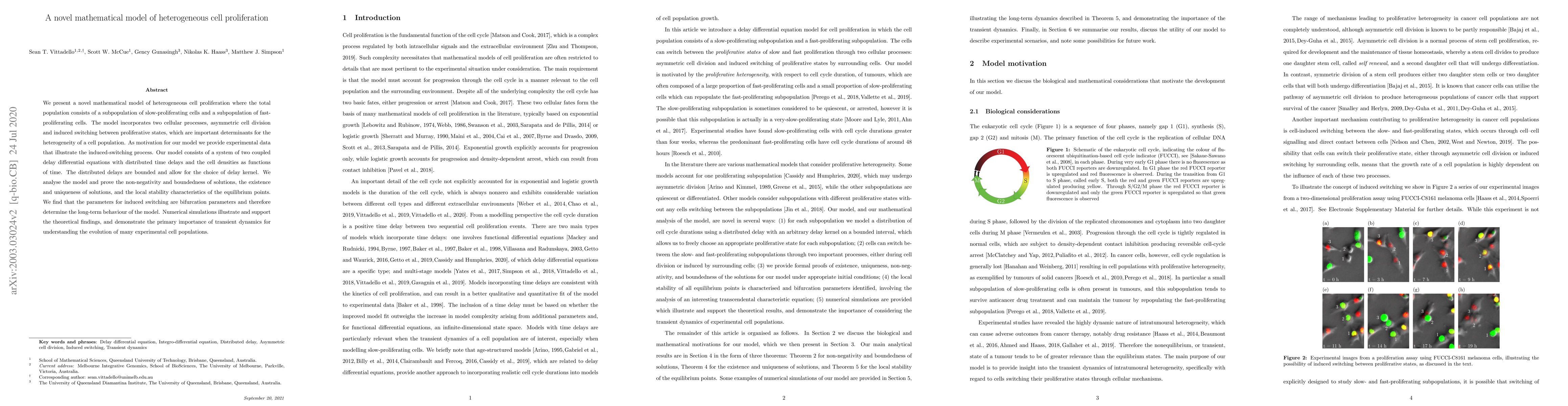 We present a novel mathematical model of heterogeneous cell proliferation where the total population consists of a subpopulation of slow-proliferating cells and a subpopulation of fast-proliferating cells. The model incorporates two cellular processes, asymmetric cell division and induced switching between proliferative states, which are important determinants for the heterogeneity of a cell population. As motivation for our model we provide experimental data that illustrate the induced-switching process. Our model consists of a system of two coupled delay differential equations with distributed time delays and the cell densities as functions of time. The distributed delays are bounded and allow for the choice of delay kernel. We analyse the model and prove the non-negativity and boundedness of solutions, the existence and uniqueness of solutions, and the local stability characteristics of the equilibrium points. We find that the parameters for induced switching are bifurcation parameters and therefore determine the long-term behaviour of the model. Numerical simulations illustrate and support the theoretical findings, and demonstrate the primary importance of transient dynamics for understanding the evolution of many experimental cell populations.