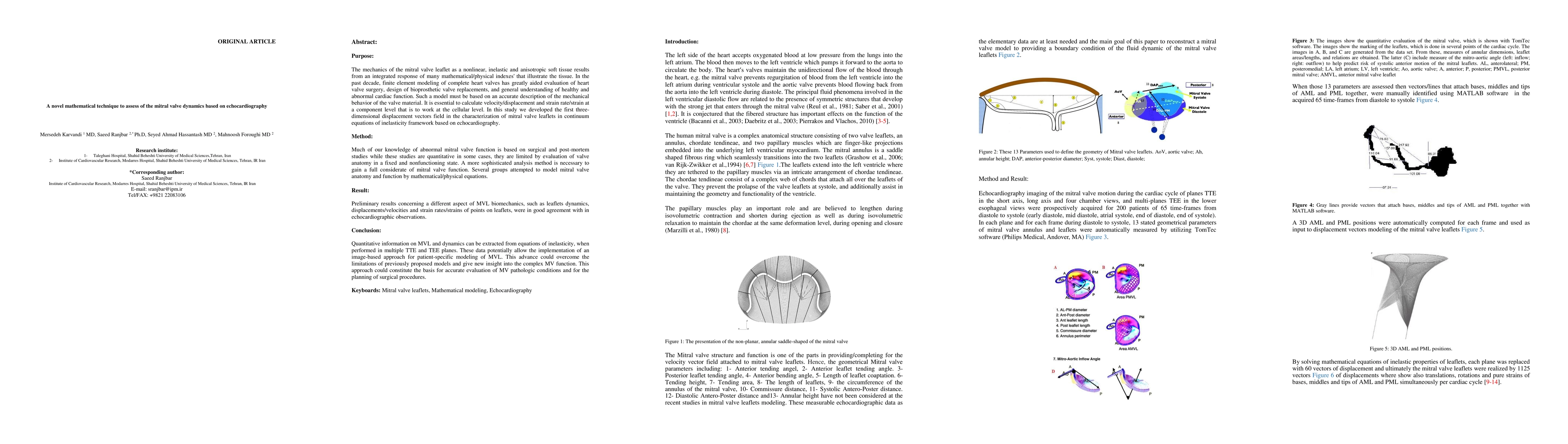Purpose: The mechanics of the mitral valve leaflet as a nonlinear, inelastic and anisotropic soft tissue results from an integrated response of many mathematical/physical indexes' that illustrate the tissue. In the past decade, finite element modeling of complete heart valves has greatly aided evaluation of heart valve surgery, design of bioprosthetic valve replacements, and general understanding of healthy and abnormal cardiac function. Such a model must be based on an accurate description of the mechanical behavior of the valve material. It is essential to calculate velocity/displacement and strain rate/strain at a component level that is to work at the cellular level. In this study we developed the first three-dimensional displacement vectors field in the characterization of mitral valve leaflets in continuum equations of inelasticity framework based on echocardiography. Method: Much of our knowledge of abnormal mitral valve function is based on surgical and post-mortem studies while these studies are quantitative in some cases, they are limited by evaluation of valve anatomy in a fixed and nonfunctioning state. A more sophisticated analysis method is necessary to gain a full considerate of mitral valve function. Several groups attempted to model mitral valve anatomy and function by mathematical/physical equations. Result: Preliminary results concerning a different aspect of MVL biomechanics, such as leaflets dynamics, displacements/velocities and strain rates/strains of points on leaflets, were in good agreement with in echocardiographic observations.