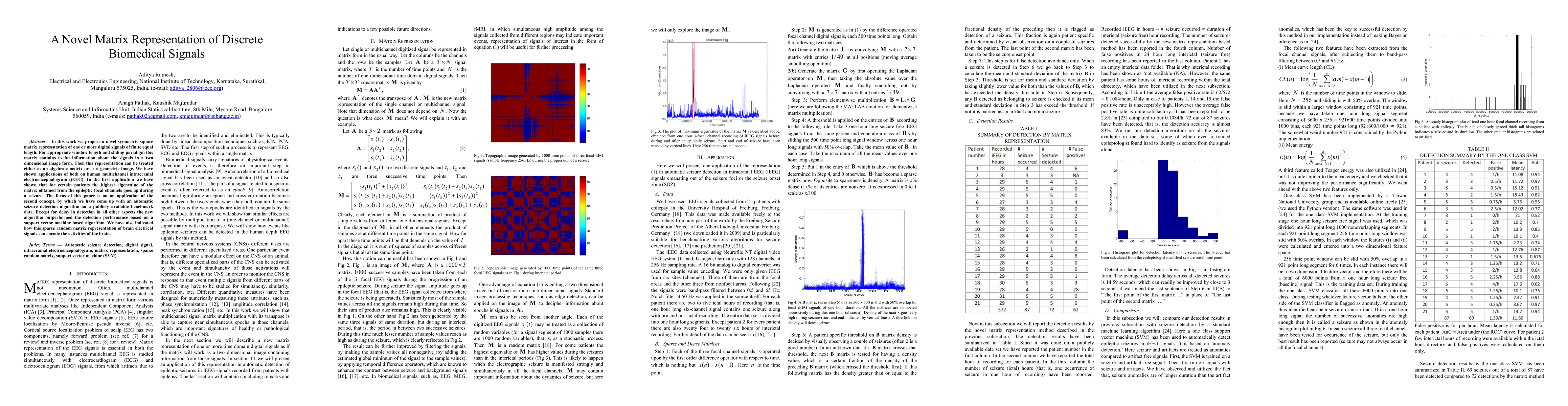 In this work we propose a novel symmetric square matrix representation of one or more digital signals of finite equal length. For appropriate window length and sliding paradigm this matrix contains useful information about the signals in a two dimensional image form. Then this representation can be treated either as an algebraic matrix or as a geometric image. We have shown applications of both on human multichannel intracranial electroencephalogram (iEEG). In the first application we have shown that for certain patients the highest eigenvalue of the matrix obtained from the epileptic focal channels goes up during a seizure. The focus of this paper is on an application of the second concept, by which we have come up with an automatic seizure detection algorithm on a publicly available benchmark data. Except for delay in detection in all other aspects the new algorithm outperformed the detection performance based on a support vector machine based algorithm. We have also indicated how this sparse random matrix representation of brain electrical signals can encode the activities of the brain.