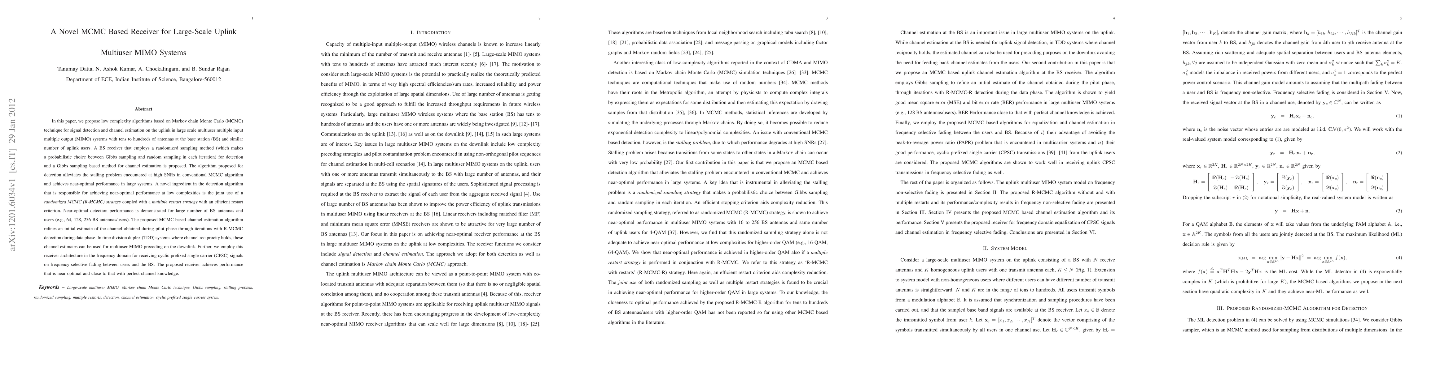 This paper proposes low complexity MCMC-based algorithms for signal detection and channel estimation in large-scale uplink multiuser MIMO systems. The proposed receiver employs a randomized MCMC strategy with multiple restarts for near-optimal detection performance and Gibbs sampling for channel estimation, achieving near-optimal results with reduced complexity.